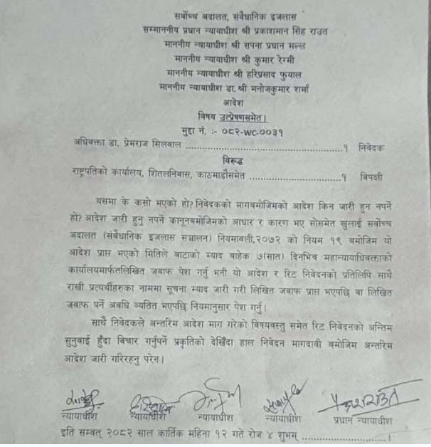 इजलासले राष्ट्रपति कार्यालय र प्रधानमन्त्री तथा मन्त्रिपरिषद्को कार्यालयलाई महान्यायाधिवक्तामार्फत सात दिनभित्र लिखित जवाफ पेश गर्न आदेश दिएको छ ।