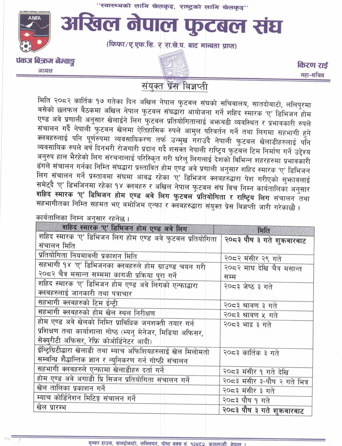 एन्फा र ए डिभिजन क्लबबीच सोमबार भएको छलफलमा २०८३ पुसदेखि सुरु हुने सहिद स्मारक लिगलाई होम एन्ड अवे आधारमा सञ्चालन गर्ने सहमति भएको हो ।