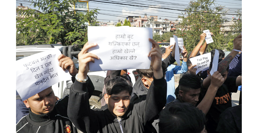 काठमाडौं । ए डिभिजन लिग यस वर्ष नगरी अर्को वर्ष मात्र गर्ने निर्णयविरुद्ध फुटबल खेलाडीहरू प्रदर्शनमा उत्रिएका छन्। नेपाल फुटबल खेलाडी संघको आयोजनामा बिहीबार खेलाडीहरूले सातदोबाटोस्थित अखिल नेपाल फुटबल संघ (एन्फा) मुख्यालयमा प्रदर्शन गरेका हुन्।