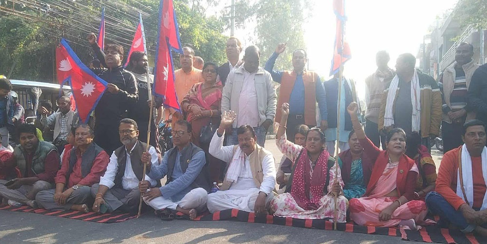 काठमाडाैं । जनकपुरधामको बिहानको चिसो हावा भित्र, मधेश भवन अगाडि सात दलका नेता र कार्यकर्ता धर्नामा बसेका थिए। यो धर्ना कुनै साधारण प्रदर्शन होइन; यहाँको एउटा दृश्यले देशभक्तिको भाव र राजनीतिक असन्तुष्टिलाई सुस्पष्ट रूपमा झल्काउँछ – सबैले आफ्ना पार्टीको झण्डा होइन, नेपालको राष्ट्रिय झण्डा बोकेका थिए।