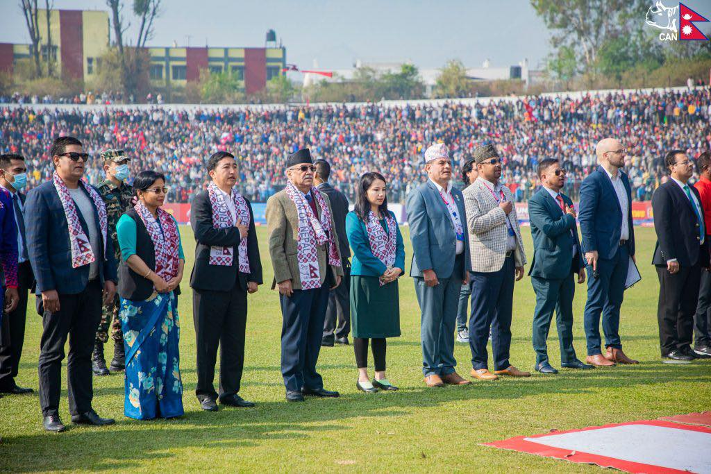 २०८१ असार ३१ (जुलाई १४, २०२५): प्रचण्डको राजीनामा भयो । स्टेडियमको काम ९५% मा पुगे पनि पूर्ण सम्पन्न नभई ओली सरकारमा हस्तान्तरण भयाे । ठेक्का विवाद, डिजाइन परिवर्तन र ढिलाइले प्रभावित भयाे ।