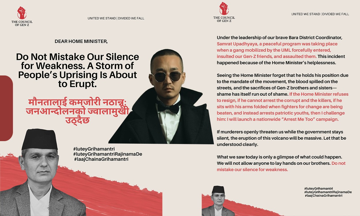 गुरूङले फेसबुकमा साझा गरेको पोस्टरमा ‘मौनतालाई कमजोरी नठान्नू, जनआन्दोलनको ज्वालामुखी उठ्दैछ’ भन्ने नाराका साथ गृहमन्त्रीविरुद्ध तीन वटा ह्यासट्याग ट्याग गरिएको छ । उनले गृहमन्त्री अर्यालको नेतृत्वमा बारामा बुधबार जेनजी कार्यकर्तामाथि कुटपिट भएको आरोप लगाउँदै ती घटनाप्रति उदासीनता देखाइएको दाबी गरेका छन् ।