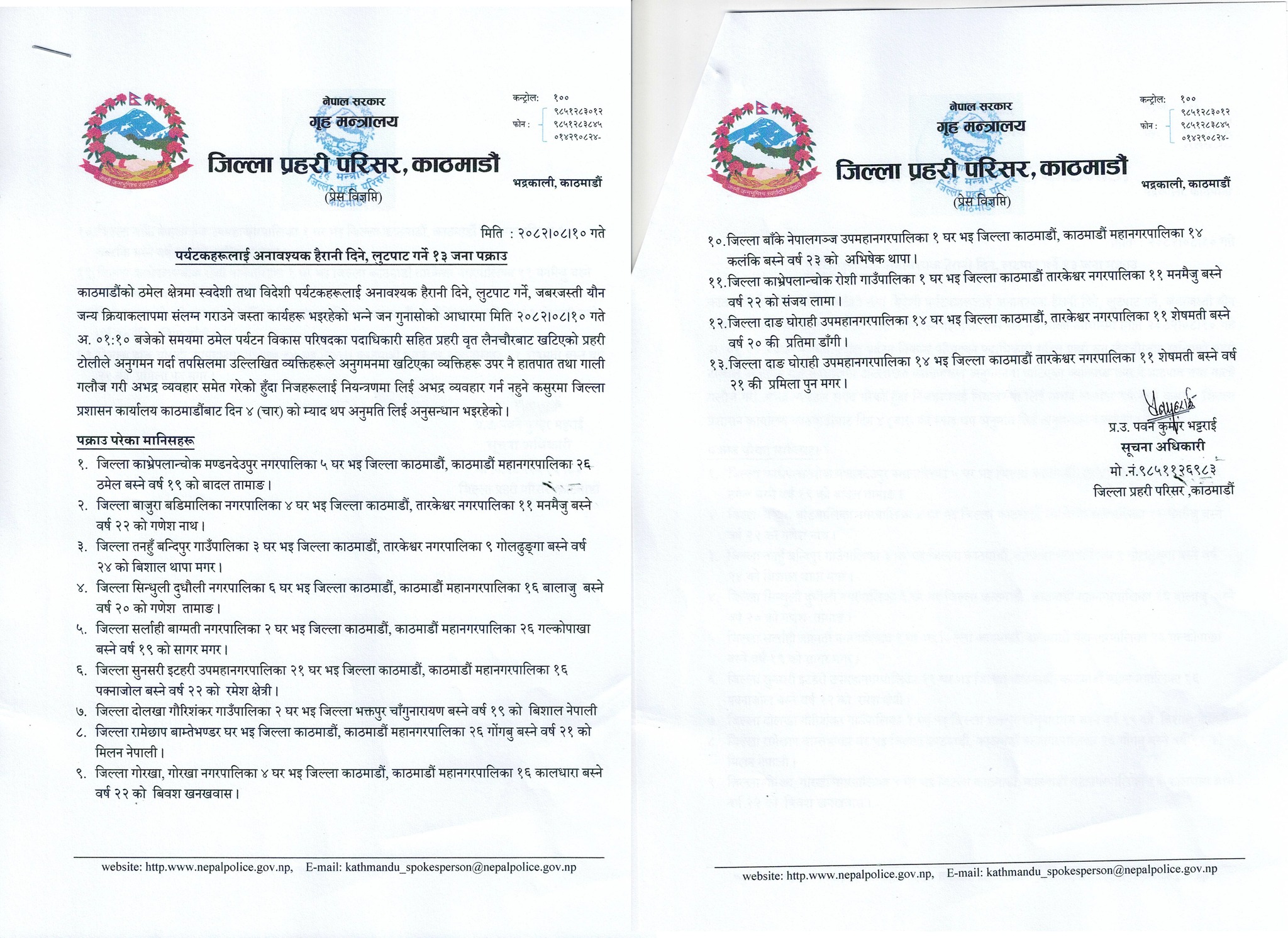 काठमाडाैं । काठमाडाैंकाे ठमेल क्षेत्रमा पर्यटकलाई हैरानी गरेको तथा जबरजस्ती यौनजन्य क्रियाकलापमा संलग्न गराउने गतिविधिमा संलग्न रहेको आरोपमा १३ जना पक्राउ परेका छन् ।