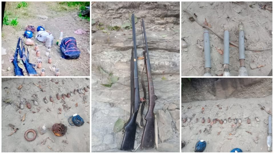 प्रहरीका अनुसार घटनास्थलबाट भरुवा बन्दुक २ थान, ग्रिनेड १४ वटा, डेटोनेटर १२ वटा, लामो लञ्चर जस्तो देखिने प्लास्टिक पाइप ३ वटा, पाँच लिटरको प्रेसर कुकर बम १ वटा, स्टिलको बम १ वटा, बिजुलीको तार ४ बन्डल र करिब ५०० ग्राम बारुद फेला परेको छ ।