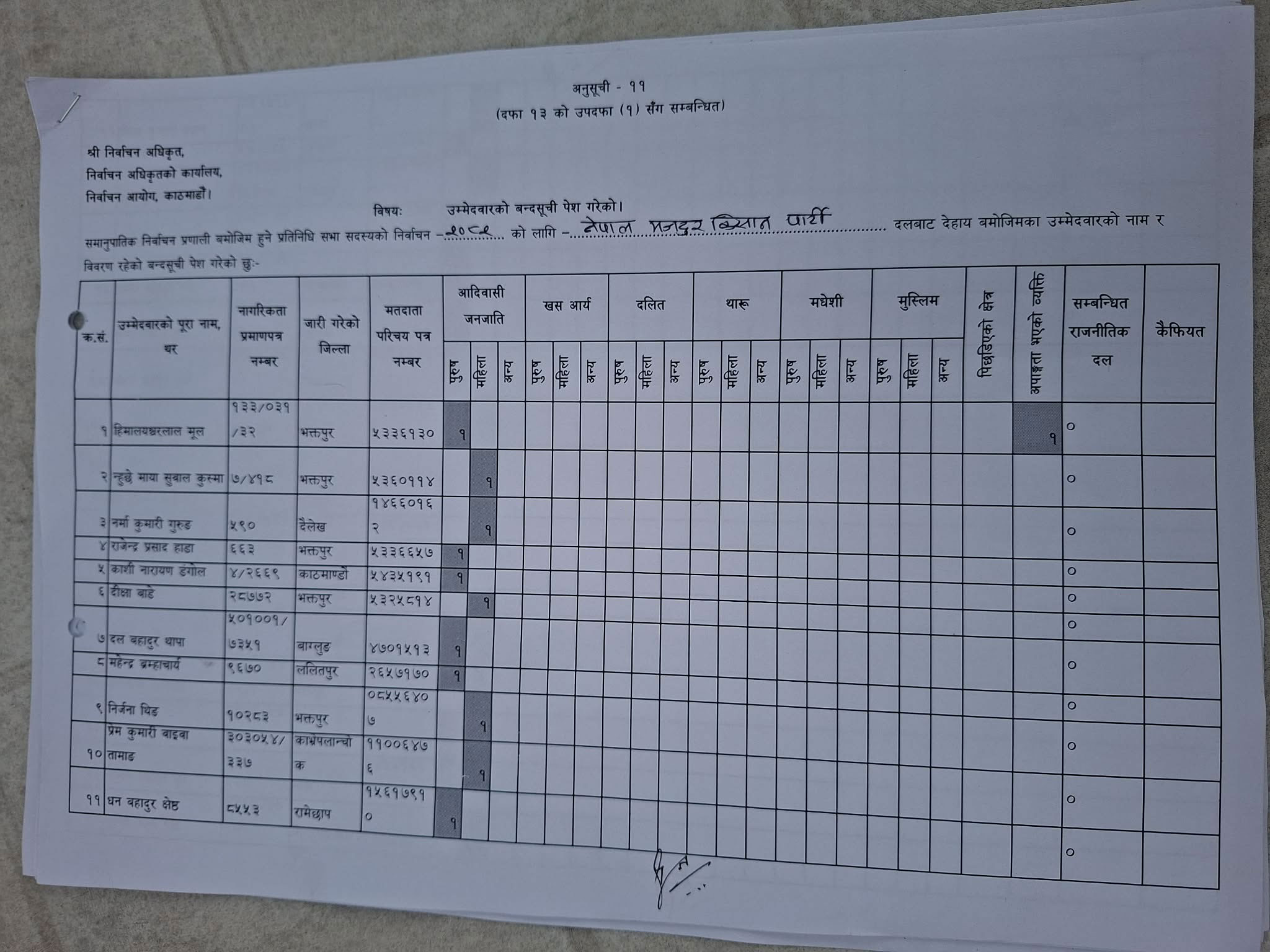 काठमाडाैं । आगामी २१ फागुनमा हुन लागेको प्रतिनिधिसभा सदस्य निर्वाचनको लागि नेपाल मजदुर किसान पार्टीले समानुपातिकतर्फका उम्मेदवारको बन्दसूची निर्वाचन आयोगमा बुझाएको छ। नेमकिपाले आइतबार निर्वाचन आयोगलाई सूची बुझाएको हो।