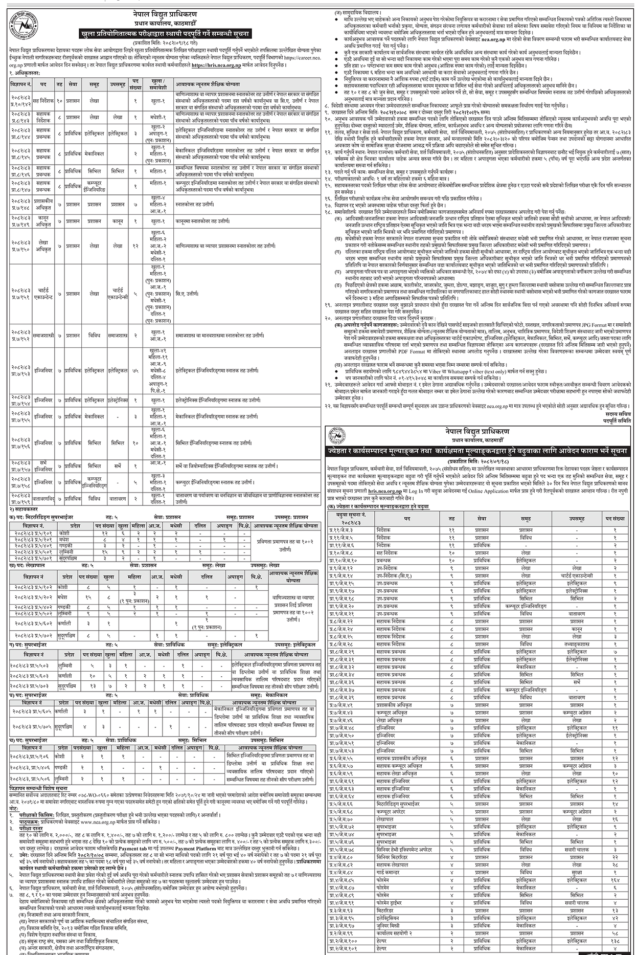 प्राधिकरणले अधिकृत स्तरका विभिन्न पदहरू (सहनिर्देशकदेखि वातावरणविद्सम्म) मा १३२ जना र सहायक स्तरका पदहरू (मिटर रिडिङ सुपरभाइजर, सुपरभाइजर र लेखापाल) मा १३० जनाका लागि विज्ञापन प्रकाशित गरेको हो।