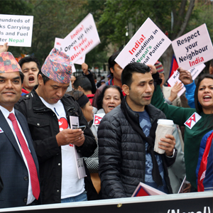 नेपालमा भारतले अघोषित नाकाबन्दीे गरेकाले अमेरिकामा बसेका नेपालीले संयुक्त राष्ट्रसङ्घको ७० औं महासभाका क्रममा संयुक्त राष्ट्रसङ्घ भवन अगाडि विरोध जनाउँदै । तस्बिर : सूर्यचन्द्र बस्नेत, रासस \"rastsangha\"