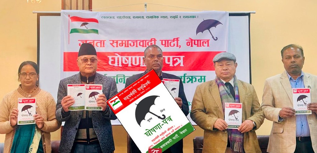 काठमाडौं । जनता समाजवादी पार्टी नेपाल (जसपा) ले फागुन २१ को चुनावलाई लक्षित गर्दै आफ्नो घोषणापत्र सार्वजनिक गरेको छ। शुक्रबार काठमाडौंमा आयोजित पत्रकार सम्मेलनमार्फत घोषणापत्र सार्वजनिक गरिएको हो।