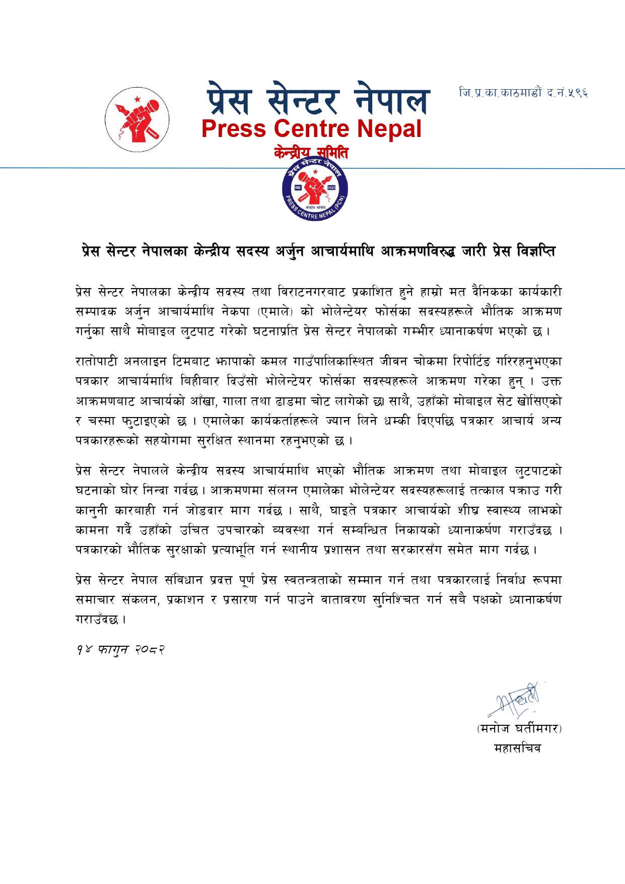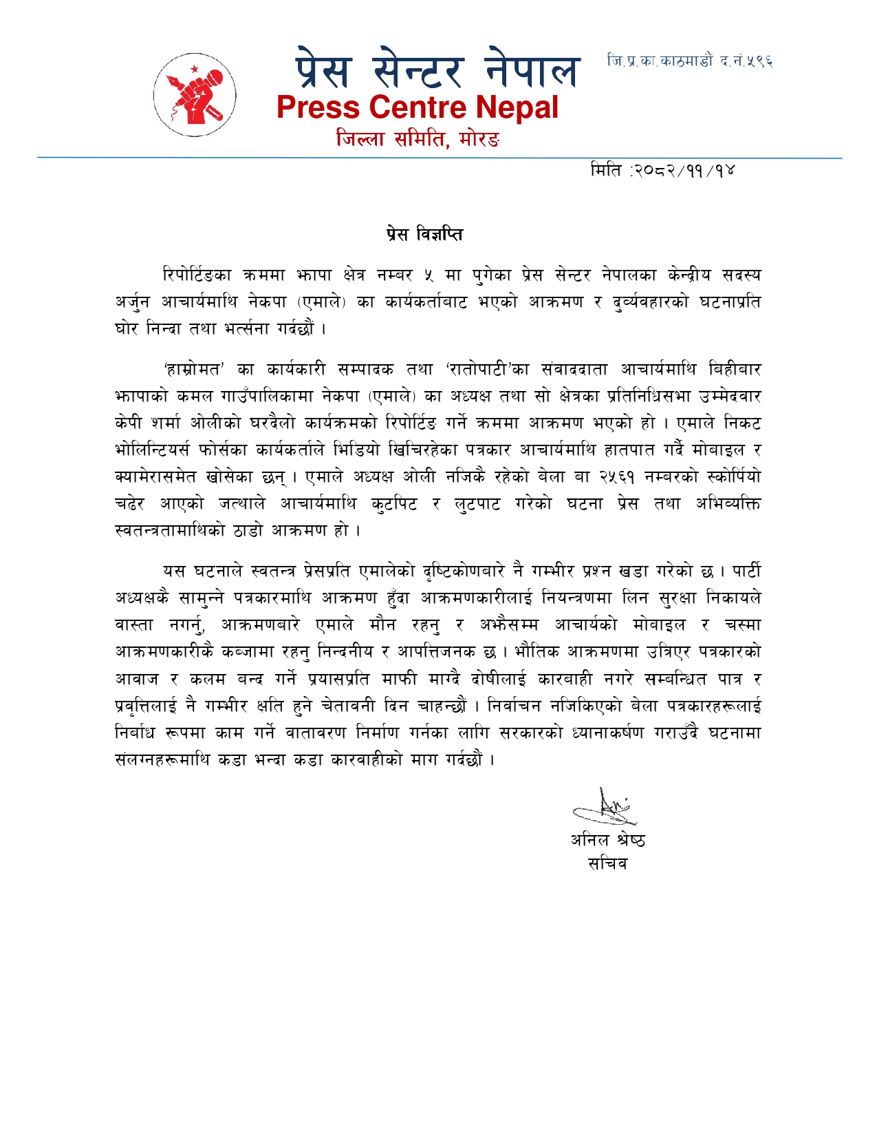 काठमाडौं । प्रेस सेन्टर नेपालले आफ्ना केन्द्रीय सदस्य तथा विराटनगरबाट प्रकाशित हुने ‘हाम्रो मत’ दैनिकका कार्यकारी सम्पादक अर्जुन आचार्यमाथि भएको आक्रम...