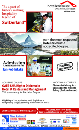 काठमाडौं, स्वीस होटल एसोसियसनको सम्बन्धनमा नेपालमा होटल व्यवस्थापन तथा आतिथ्य सत्कार शिक्षा अध्यापन गराउँदै आएको एसियाकै पहिलो शैक्षिक प्रतिष्ठान ग्लोबल एकेडेमी अफ टुरिज्म एन्ड हस्पिटालिटी एजुकेशन (गेट कलेज) मा होटल व्यवस्थापन शिक्षाका आयामहरूबारे अभिमुखीकरण कार्यक्रमको आयोजना गरियो । कार्यक्रममा नेपालको पर्यटन तथा होटल व्यवस्थापन शिक्षाका विभिन्न आयामबारे प्रकाश पारियो । गेट कलेजका प्रमुख कार्यकारी अधिकृत खेम लकाईंले पर्यटनले नेपालको अर्थतन्त्रमा ४ प्रतिशतसम्म मात्र हिस्सा ओगटेकोमा यसलाई वृद्धि गरी १० प्रतिशतसम्म पुर्‍याउन सकिने बताए । देशको पर्यटन क्षेत्रमा पूर्वाधार, जनशक्ति लगायत क्षेत्रको पर्याप्त विकास हुनुपर्ने भन्दै उनले यसका लागि गुणस्तरीय पर्यटन तथा होटल व्यवस्थापन शिक्षामा जोड दिए । ‘नेपालको होटल व्यवस्थापनका क्षेत्रमा अझै पनि पर्याप्त दक्षतायुक्त शैक्षिक जनशक्ति पुगेकै छैन’, लकाईंले भने– ‘सन् २०२० सम्म नेपालमा २० लाख पर्यटक आगमन पुर्‍याउने देशको लक्ष्य छ, त्यसका लागि हामीले अहिलेदेखि नै पर्याप्त जनशक्तिको विकास गर्नु पर्दछ ।’ तर, सही ढंगले पर्यटन पूर्वाधार, जनशक्ति विकास, उचित बजारीकरण, प्रचारप्रसार र व्यावसायिकताको प्रबर्द्धन गर्ने हो भने यो लक्ष्य २०१८ सम्ममै हासिल गर्न सकिने लकाईंको दाबी छ। उनका अनुसार हाल देशको पर्यटन क्षेत्रलाई आवश्यक पर्ने कूल दक्ष शक्तिमध्ये आधा मात्र उपलब्ध भइरहेको छ। अधिकांश दक्ष शैक्षिक जनशक्तिको रोजार्इ विदेश नै हुने गरेकोमा नेपालमै काम गर्ने योग्य र दक्ष शैक्षिक होटल व्यवस्थापनसम्बन्धी जनशक्तिको अभाव खड्किएको हो। हाल नेपालमा प्रतिवर्ष पर्यटकहरुको आगमनदर ८ लाख मात्र पुगेको छ। नेपाल सरकारले १० लाख पर्यटक पुर्‍याउने लक्ष्य राखेको छ। हाल नेपालमा १० वटा पाँचतारे होटलसहित ३ सयको हाराहारी मात्र पर्यटकस्तरीय तारे होटल, रिसोर्ट तथा रेष्टुरेन्टहरू छन्। यिनीहरूका लागि समेत  दक्ष जनशक्तिको अभाव छ। गेट कलेजले आगामी सन् २०२५ भित्रमा नेपाललाई अन्तर्राष्ट्रिय पाँचतारे पर्यटन गन्तव्य (फाइभ स्टार डेस्टिनेसन) का रुपमा विकास गर्ने मूल लक्ष्यसहित स्वीस स्तरीय होटल व्यवस्थापन शिक्षा प्रदान गर्दै आइरहेको दावी गरिएको छ। गेट कलेजले विगत ७ वर्षदेखि नेपालमै स्वीस स्तरीय होटल व्यवस्थापन शिक्षा अध्यापनका लागि आवश्यक शैक्षिक वातावरण तयार पारेको बताउँदै लकाईंले होटल व्यवस्थापनमा सम्भावना भएका विद्यार्थीहरूलाई भर्ना प्रक्रियाद्वारा छनोट गर्ने ग\"gate\"रिएको जानकारी दिए । गेट कलेजमा अहिले १५औं ब्याचका विद्यार्थीहरु अध्ययनरत छन्। होटल व्यवस्थापन अध्ययन गर्नका लागि उत्साहजनक सहभागित