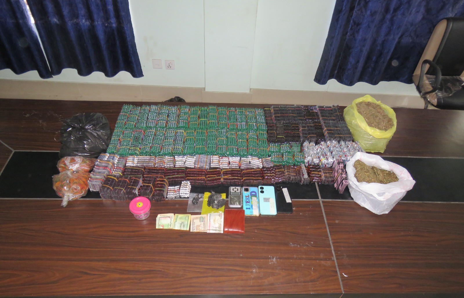 कोठाबाट ७ ग्राम ८ सय ९० मिलिग्राम ब्राउन सुगर र २ किलो २ सय ३० ग्राम गाँजा बरामद भएको छ। ब्राउन सुगर दुई फरक पोकामा राखिएको अवस्थामा फेला परेको प्रहरीले जनाएको छ।