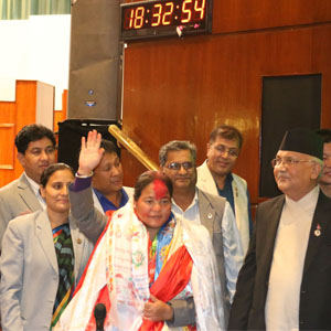 \"savamukh1\"व्यवस्थापिका संसदमा शुक्रबार भएको सभामुख पदको निर्वाचनमा एकीकृत नेकपा माओवादीकाका सभासद् ओनसरी घर्ती निर्वाचित भएपछि अभिवादन गर्नुहुँदै, साथमा प्रधानमन्त्री केपी शर्मा ओली लगायत अन्य सभासद्हरु । तस्बिरः रत्न श्रेष्ठ, रासस