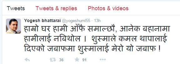 \"yogesh\"काठमाडाैं । नेपालका परराष्ट्र मन्त्री कमल थापासँगको भेटमा भारतीय विदेशमन्त्री शुष्मा स्वराजले समावेशी संविधान नबन्दा नेपालमा समस्या आएको बताएपछि एमाले सचिव योगेश भट्टराईले चेतावनी दिएका छन् ।   अनेक बहानामा नेपाललाई नबोल्न आग्रह गर्दै सचिव भट्टराईले आफ्नो घर आफैं बनाउने भन्दै सामाजिक संजामार्फत चेतावनी दिएका हुन् । ‘हाम्रो घर हामी आँफै समाल्छौ, आनेक बहानामा हामीलाई नबिथोल । शुस्माले कमल थापालाई दिएको जबाफमा शुस्मालाई मेरो यो जबाफ ।’ भट्टराईले कमल थापाको भेपछि आएको प्रतिक्रियामा आधारित हुँदै ट्वीट गर्दै लेखेका छन् ।   थापासँगको भेटमा भारतीय विदेश सचिव एस जयशंकरले पनि नेपालको संविधान कति दिनमा संसोधन हुन्छ भनी परराष्ट्र मन्त्री कमल थापालाई दिन तोक्न दबाब दिएका थिए ।   उनको दबाबपछि असन्तुष्टी व्यक्त गर्दै थापा आक्रोशित हुँदै बाहिरिएका थिए । भारतले तीन हप्तादेखि गरिरहेको नाकाबन्दी खुलाउने पहल गर्नका लागि थापा शनिबार नयाँ दिल्ली प्रस्थान गरेका थिए ।   भारतले अब पनि नटेरी नाकाबन्दी नखुलाए चीनसँग कुराकानी गरी नाकाबन्दीको विकल्प खोज्न सरकारलाई दबाब परेको छ । चीनले पनि नेपालले चाहेजति इन्धन दिन तयार रहेको भन्दै आवश्यक प्रक्रिया अघि बढाउन तयार रहन नेपाल सरकारकारालाई आग्रह गरिसकेको छ ।