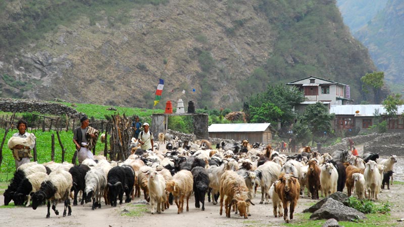 \"manaslu-tal-sheep-800\"मुस्ताङ । नेपालीहरुका दुई ठूलो पर्व दसैं र तिहारमा हिमाली जिल्ला मुस्ताङबाट १८ हजार ३०८ भेडाच्याङ्ग्रा निर्यात भएको छ । उपल्लो मुस्ताङको विभिन्न छ गाविसबाट दसैँमा १५ हजार ३०८ र तिहारमा तीन हजार भेडाच्याङ्ग्रा जिल्लाबाट बाहिरिएको जिल्ला पशुसेवा कार्यालय मुस्ताङले जनाएको छ । ती भेडाच्याङ्ग्राबाट यहाँका किसानले २८ करोड ७२ लाख ३६ हजार आम्दानी गर्न सफल भएका छन् । मुस्ताङका लोमान्थाङ, छोसेर, छोन्हुप, घमी र सुर्खाङलगायतका किसानले जिल्ला सदरमुकाम जोमसोमसम्म लिएर व्यापारीलाई भेडा प्रतिवटा १५ हजार र च्याङ्ग्रा १७ हजारमा बिक्री गरेका थिए । स्थानीय किसानबाट म्याग्दी, बागलुङ, पर्वत, कास्की, काठमाडौँलगायतका व्यापारीले खरिद गरी बजारमा ल्याएका थिए । यसवर्ष भारतीय नाकाबन्दीका कारण तराई क्षेत्रबाट काठमाडौँमा खसी ल्याउन सम्भव नभएपछि नेपाल खाद्य संस्थानले पनि एक हजार भेडाच्याङ्ग्रा मुस्ताङबाटै लगेको जिल्ला पशुसेवा कार्यालयले जनाएको छ । दसैँमा नौ हजार भेडा र छ हजार ३०८ च्याङ्ग्रा तथा तिहारमा तीन हजार भेडा निर्यात भएको पशुसेवा कार्यालयका प्राविधिक फलेन्द्र थकालीले जानकारी दिए । भेडाबाट १८ करोड र च्याङ्ग्राबाट १० करोड ७२ लाख ३६ हजार आम्दानी भएको प्राविधिक थकालीले जानकारी दिए । ‘यसवर्ष साविकको वर्षभन्दा करिब दुई हजार भेडाच्याङ्ग्रा कम आए, तिब्बतबाट नआउँदा स्थानीय किसानले पालेकै भेडाच्याङ्ग्रा बजार गएका हुन् ’, प्राविधिक थकालीले भने –‘उपल्लो क्षेत्रका किसानको आम्दानी हुने मुख्य मौसम नै दसैँ तिहार हो ।’ व्यापारीले किसानबाट सस्तोमा खरिद गरेर बजारमा भने भेडा कम्तीमा २० हजार र च्याङ्ग्रा २३ हजारसम्ममा बिक्री गरेका थिए । उपल्लो मुस्ताङलाई भेडापालनका लागि पकेट क्षेत्र मानिन्छ । उच्च हिमाली क्षेत्रमा विभिन्न किसिमका जडीबुटी खाएका भेडाच्याङ्ग्राको मासु स्वादिलो र स्वास्थ्यका लागि फाइदाजनक हुने बताइएको छ । मुस्ताङमा भेडा कम र च्याङ्ग्रा बढी पाल्ने परम्परा छ भने अधिकांश भेडा तिब्बतबाट ल्याएर पाल्ने गरिन्छ । रासस