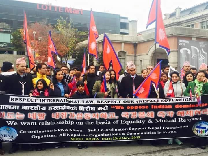 \"korea सउल  । दक्षिण कोरियामा रहेका नेपालीहरुले कोरियाको भारतीय दूतावास अघि प्रदर्शन गरेका  छन् । दक्षिण कोरियामा क्रियाशील नेपालीहरुको विभिन्न संघ संस्थाहरुको आयोजनामा प्रदर्शन गरिएको हो । भारतले नेपालमा गरेको नाकाबन्दीको विरोधमा प्रदर्शन गरेका हुन् । कोरियामा रहेका नेपालीहरुको प्रदर्शन अहिलेसम्मकै ठूलो प्रदर्शन हो । सउल स्टेशन अगाडिको मैदानमा जम्मा भएर नेपालीहरुले प्रदर्शन गरेका हुन् । नेपाली पोशाकमा जम्मा भएका नेपालीहरुले सउल स्टेशनबाट हाननामस्थित इण्डियन एम्बेस्सीसम्म झण्डै साढे पाँच किलोमिटर र्याली गर्दैछन् । र्यालीपछि भारतीय दूतावासमा विरोधपत्र बुझाउने आयोजकले जनाएको छ । भारतले नेपालमाथि गरेको नाकाबन्दीको विरोधमा कोरियामा रहेका नेपालीहरुले कोरियास्थित भारतीय दूतावासलाई ज्ञापनपत्रसमेत बुझाउँदैछन् । भारतले नाकाबन्दी गरी नेपाललाई दुःख दिएको भन्दै विदेशमा रहेका नेपालीहरुले प्रदर्शन जारी राखेका छन् । गैरआवासीय नेपाली संघ एनआरनको अगुवाईमा न्यूयोर्कस्थित राष्ट्र संघ मुख्यालय प्रदर्शन गरेका थिए । अमेरिकामा रहेका नेपालीहरुले आइतबार वासिंगटन डीसीमा विशाल प्रदर्शन गरी भारतले गरेको नाकाबन्दीको विरोध गरेका थिए । अमेरिकामा रहेका नेपालीहरुले आइतबार वासिंगटन डीसीमा विशाल प्रदर्शन गरी भारतले गरेको नाकाबन्दीको विरोध गरेका थिए । \"korea-2\"