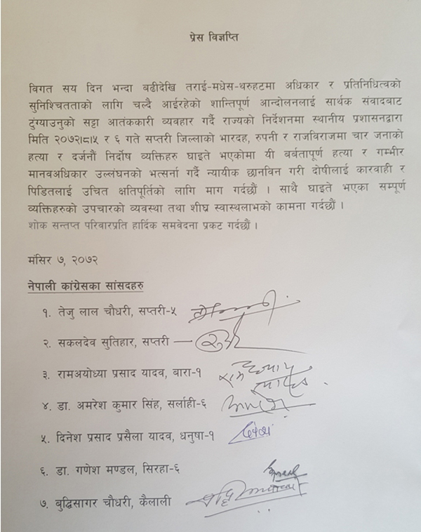 सोमबार एक प्रेस विज्ञप्ति जारी गर्दै कांग्रेस सांसदहरुले विगत सय दिन भन्दा बढीदेखि तराई–मधेस–थरुहटमा अधिकार र प्रतिनिधित्वको सुनिश्चितताको लागि चल्दै आईरहेको शान्तिपूर्ण आन्दोलनलाई सार्थक संवादबाट टुंग्याउनुको सट्टा आतंककारी व्यवहार देखाएको आरोप लगाएका छन्।