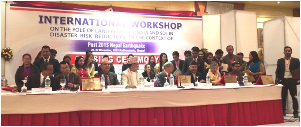 \"Untitled\"काठमाडौं । भूकम्पबाट क्षतिग्रस्त भौतिक संरचनाको पुनर्निर्माण र सुरक्षित आवास एवम् भौतिक संरचना निर्माणका लागि सरकार संवेदनशील भएन भन्ने गुनासो आइरहेको समयमा भावी पुनर्निर्माण र नव निर्माणको कार्यलाई प्रभावकारी बनाउदै विपद् जोखिम न्यूनिकरण गर्नका लागि यस क्षेत्रमा कार्यरत प्राविधिक र प्रशासकहरुले नयाँ अग्रसरता लिएका छन् । यसै सन्दर्भमा भूमिको क्षेत्रमा कार्यरत प्राविधिक र प्रशासकहरुद्धारा आयोजित नेपालमा भूकम्प पछिको सन्दर्भमा विपद् जोखिम न्यूनिकरणमा भूमिसम्बन्धी पेशाकर्मी र भूमि सम्बन्धी तथ्याड.कको भूमिका बिषयक तीन दिवसीय अन्तराष्ट््िरय गोष्ठी ६ बूँदे प्रस्ताव पारित गर्दै आज काठमाण्डौमा सम्पन्न भएको छ । नेपाल फोटो ग्रामेट््री एण्ड रिमोट सेन्सिड. सोसाइटीका अध्यक्ष तथा भूमि व्यवस्था प्रशिक्षण  प्रतिष्ठानका महानिर्देशक रविनकाजी शर्माको अध्यक्षतामा भएको तीन दिवसीय  गोष्ठीको समापन समारोहमा भूमि सुधार तथा व्यवस्था मन्त्री रामकुमार सुब्बाले देशले विषम परिस्थिति झेलिरहेको समयमा पनि राष्ट्र्यि महत्व समेत रहेको अन्तराष्ट््िरय गोष्ठी सम्पन्न गरेर यस क्षेत्रका पेशाकर्मीहरुले नेपालीहरु भूकम्प पछिको पुनर्निर्माणकालागि तत्पर छन् भन्ने सन्देश दिएको बताए । उनले सरकार भूकम्पले क्षतिग्रस्त भौतिक पूर्वाधारहरुको निर्माणमा संवेदनशील रहेको उल्लेख गरे । समापन समारोहमा आयोजक समितिका अध्यक्ष एवम् नापी विभागका उपमहानिर्देशक गणेशप्रसाद भट्टले नेपालमा विनासकारी भूकम्प गएपछि पनि आयोजक र प्रायोजकहरुले यस गोष्ठीलाई सान्दर्भिक र सामयिक बनाएर सम्पन्न गराउन दिनुभएको हौसलाको सराहना गरे । उनले अप्ठ्यारो परिस्थितिमा पनि नेपालीहरु ठूला कार्यक्रम गर्न समर्थ भएको प्रमाण गोष्ठीको सफलताले दिएको उल्लेख गरे । उनले भूकम्प जस्ता प्राकृतिक प्रकोपको असर जमीनमा पर्ने भएकोले भूमिसम्बन्धी पेशाकर्मीहरुको व्यवसायिक क्षमता अभिबृद्धि, विश्वमा प्रचलित नविनतम् सिद्धान्त र प्रविधिको उपयोगका लागि यो गोष्ठी उपयोगी भएको बताए । कार्यक्रममा पूर्वप्रधानमन्त्री सुशील कोइरालाका प्रशासनिक सल्लाहकार एवम् पूर्व सचिव बाबुराम आचार्यले भूमि सम्बन्धी पेशाकर्मीहरुको ज्ञान र अनुभव अभिबृद्धिका साथै विपद् जोखिम न्यूनिकरणका लागि अपनाउनु पर्ने पद्धतिका सम्बन्धमा गोष्ठीमा सार्थक छलफल भएको बताउनु भयो । उहाँले निकट भविष्यमा आरम्भ हुने भूकम्पेत्तर पुनर्निर्माणका लागि पनि गोष्ठीका निष्कर्षहरु उपलब्धिमूलक भएको बताए  । समापन कार्यक्रममा इन्टरनेशनल सोसाइटी फर फोटोगाम्रेटी एण्ड रिमोट सेन्सिड.का सहअध्यक्ष डा. देवराज पौडेल  नापी पेशाकर्मीहरुको अन्तरा