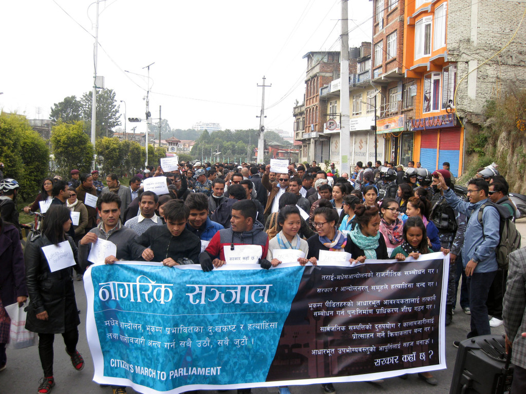 \"CitizensMarch-Mansirकाठमाडौं । मधेस आन्दोलनलाई तत्काल संवोधन गर्नु पर्ने माग गर्दै आज काठमाडौको नयाँ बानेश्वरमा नागरिक समाजको नेतृत्वमा  प्रर्दशन गरेको छ । मधेश आन्दोलन, भूकम्प प्रभावितका दुस्ख कष्र्टे र हत्याहिंसा तथा कालोबजारी अन्त्य गर्न सबै उठौं, सबै जुटौं’ आह्वानसहित नागरिक सञ्जालको पहलमा उत्त र्याबली आयोजना गरिएको थियो । \"CitizensMarch-Mansir र्याबलीमा पूर्वप्रधानमन्त्री डा। बाबुराम भट्टराई पनि सहभागी भएका थिए । प्रर्दशनमा सहभागि हरुले सरकार कहाँ छ भन्ने प्लेकार्ड सहित प्रर्दशन गरेका थिए । उनीहरुले तराइ आन्दोलनलाई तत्काल संवोधन गरेर देशमा जारी गत्यावरोधको तत्काल निकाश दिनुपर्ने , सरकार र आन्दोलकारीले हत्या हिंसा बन्द गर्नु पर्ने , कालोबजारीलाई नियन्त्रण गर्नु पर्ने माग गर्दै प्रर्दशन गरेका थिए । माइतिघरबाट सुरु भएको र्यापली बानेश्वरमा पुगी कोणसभामा परिणत भएको थियो । \"CitizensMarch-Mansir