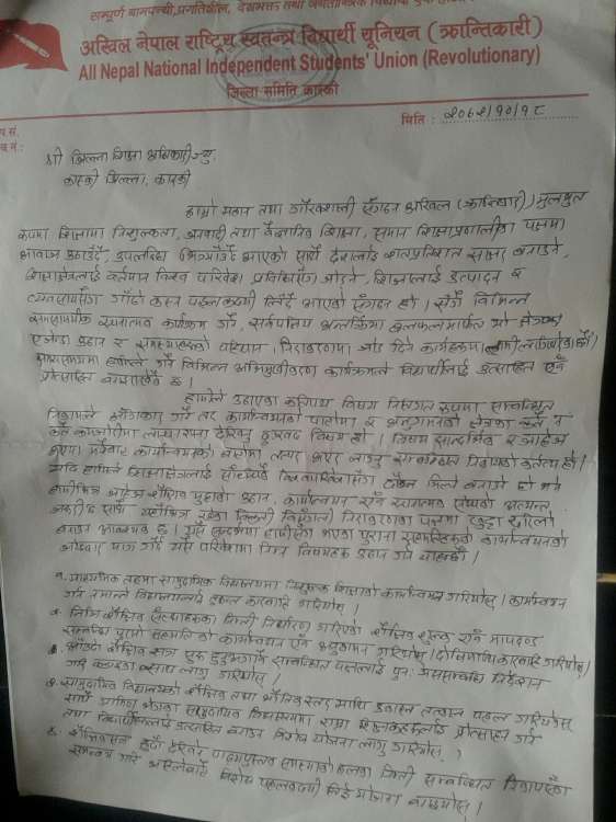 काठमाडाैं ।  एकिकृत नेकपा माओबादी निकटको भातृ संगठन (क्रान्तिकारी) ले राज्य सरकारि शिक्षाबाट अलग्गिन खोजेकोमा गंभिर चिन्ता प्रकट गरेको छ । जिल्ला शिक्षा कार्यलय कास्कीमा सोमबार जिल्ला शिक्षा अधिकारी बिष्णु अधिकारीलाई ध्यानकर्षण पत्र ध्यानाकर्षण पत्र बुझाउदै अखिल(क्रान्तिकारी) कास्कीले सरकार अहिलेको सरकारि शिक्षाबाट अलग्गिन खोजेको आरोप लगाउदै सरकार यस्तै लाचार भए संगठन चुप लागेर नवस्ने चेतवनी दिएको हो । ध्यानाकर्षण पत्रमा मध्यमिक तहमा सामुदायिक बिद्यालयमा निशुल्क शिक्षाको कार्यान्बयन गर्नुपर्ने तथा कार्यान्बयन नगर्ने बिद्यालयलाई कारबाही गनुपर्ने, निजि शैक्षिक सस्थामा शैक्षिक शुल्क मापदण्ड बारेका भएको पुर्ब सहमतिको कार्यान्यन तथा अनुगमान गनुपर्ने,सरकारी बिद्यालयमा गुणस्तर सुधारका कार्यक्रम कडाईका साथ लागु गनुपर्ने,पाठ्यपुस्तक समस्या बारेमा अहिलेबाटै समन्यवन गर्नुपने, अबैधानीक शैक्षिक सस्थाको तत्काल खारेज गनुपर्ने, तथा अखिल क्रान्तिकारि संग भएको पुर्ब सहमती कार्यान्बन गर्नुपने लगाएतका ९ बुँदे माग उल्लेख गरिएको छ । क्रान्तिकारी कास्कीका अध्यक्ष नारायण बडाल द्रारा वर्तमान शिक्षाको समस्या तथा निराकरणका उपायबारे ध्यनाकर्षण गरायका थिए भने अखिल (क्रान्तिकारी) केन्द्रिय सदस्य बिपिन आचार्य बाट निशुल्क शिक्षा नितिगत र व्यवाहीरक रुपमा कार्यान्यवन हुनुपर्नेमा जोड दिए । प्रमुख जिल्ला शिक्षा अधिकारी बिष्णु अधिकारीले ध्यानकर्षण पत्र बुझ्दै क्रान्तीकारीका माग प्रति गम्भीर ध्यानकर्षण भएको बताएका थिए ।\"uncp-750\"\"uncp