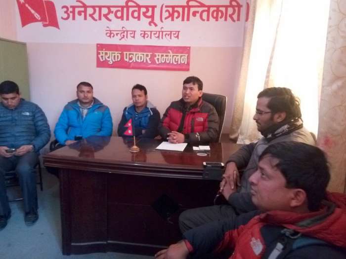 काठमाण्डौं । एमाओवादी, बैद्य माओवादी तथा बिप्लप माओवादी निकटका क्रान्तीकारी संगठनले सयुक्त रुपमा आन्दोलनको घोषणा गरेका छन् । नयाँ संबिधान जारी भइसकेको अवस्थामा पनि शिक्षामा व्याप्त अराजकता र बेथिती नियन्त्रण नभएको भन्दै मंगलबार बागबजारमा पत्रकार सम्मेलन मार्फत तीन क्रन्तिकारी बिद्याथी संगठनले ज्ञापन पत्र बुभाउने देखि भण्डाफोर सम्मका आन्दोलनको घोषणा गरको हुन । \"press तीनओटै अनेरास्ववियू (क्रान्तिकारी) ले पेट्रोलियम पदार्थ (पेट्रोल, डिजेल, ग्यास, मट्टीतेललगायत)को सहज आपुर्ति गर्न, बजारमा भएको कालोवजारी नियन्त्रण गर्न तथा अन्तर्राष्टिय बजार अनुुसार पेट्रोलियम पदार्थको मुल्य समायोजन गर्न नेपाल सरकारको ध्यानाकर्षण तथा दबाव श्रृजना गर्न माग गदै माघ २० गते आपुर्तिमन्त्रीलाई ज्ञापनपत्र, माग २१ गते आयल निगममा प्रदर्शनसहित धर्ना दिने जनाएका छन । पेट्रोलियम पदार्थको मुल्य समायोजन घटाउँदा हँुदा पनि सार्वजनिक यातायातको भाडा नघटेको भन्दै ४५ प्रतिशत विद्यार्थी सहुलीयत कार्यान्वयन गर्न माघ २२ गते भौतिक योजना तथा यातायात मन्त्रीलाई डेलीगेशनसहित ज्ञापनपत्र वुझाउने , जिल्लास्तरमा कार्यक्रम संञ्चालन गर्ने, देशभरका क्याम्पसहरु अगाडी १ घण्टा संयुक्त कोणसभा र प्रर्दशन गर्ने लगाएतको आन्दोलनको घोषणा गरेका छ । तीनओटै अनेरास्वबियू(क्रान्तिकारी) पत्रकार सम्मेलन मार्फत काठमाडौं तराई÷प्रदेश जोड्ने फाष्ट ट्रयाक निर्माण गर्ने जिम्मा बदनाम इन्डीयन कम्पनी लाई दिने तत्कालिन नेपाल सरकारको राष्टघाति र जनविरोधी निर्णय प्र्रक्रियालाई रद्द गर्न भण्डाफोर अभियान चलाउने, त्रिविको स्ववियु नियमावलीको आवश्यकता परिमार्जनसहित निर्वाचन सम्पन्न गर्न त्रिवि पदाधिकारीलाई संयुक्तरुपमा ध्यानाकर्षण गराउने , फागुन १ गते जनयुद्धको २१ औ उत्सवलाइ देशव्यापी रुपमा संयुक्त कार्यक्रम सहित सम्पन्न गर्ने लगाएतका संघर्षका कार्यक्रम घोषणा गरेको छन । \"12659843_1351581308201265_1559036023_n\"