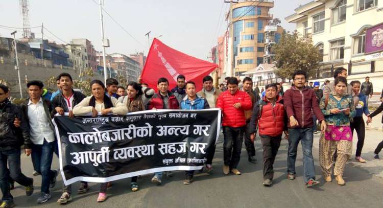 \"akhil-750\"काठमाडाैं ।  एमाओवादी, बैद्य माओवादी र बिप्लव माओवादीका निकट अखिल क्रान्तिकारी बिद्यार्थी संगठनले बबरमहलमा ¥याली सहित बिरोध प्रर्दशन गरेका छन । तीन वटा माआवादी निकट अखिल क्रान्तिकार बिद्यार्थी संगठनले बिहिबार माईतिघरबाट कालोवजारी अन्त्य गर,आपूर्ति ब्यवस्था सहज गर, अन्तराष्ट्रिय मुल्य अनुसार पेट्रोलियम पदार्थको मुल्य समायोजन गगाएतका नारा लगाउदै जुलुस सहित बबरमहलस्थित नेपाल आयल निगमको केन्द्रीय कार्यालयमा घेराउ गरेका हुन् । कालोबजारी नियन्त्रणको माग गर्दै संगठनले बिहिबार १२ देखी करिब १ बजेसम्म निगमको कार्यालय घेराउ गरेक संगठनका सदस्य सुरेन्द्र बस्नेतले जानकारी दिए । पेट्रोलियम पदार्थ को सहज आपुर्ति गर्न, बजारमा भएको कालोवजारी नियन्त्रण गर्न तथा अन्तर्राष्टिय बजार अनुुसार पेट्रोलियम पदार्थको मुल्य समायोजन गर्न नेपाल सरकारलाई दबाव दिदै कालोबजारी गर्नेलाई सरकारले कारबाही नगरेका भन्दै कडा आलोचना गरेका छन् । धर्ना कार्यक्रममा एमाओबादी निकट क्रान्तीकारीका अध्यक्ष रमेश मल्लले कालोबजारी रोक्न अब बिद्याथी संगठनले कानुन हातमा लिने बताउदै कालोबजारीलाई अब सयुक्त संगठनले कारबाही गर्ने चेताबनी दिए । सयुक्तद संगठनले नम्र आवाजको मुल्याङकन नगरे तथा आफ्ना माग पुरा नगरे दोश्रो चरणको शसक्त आन्दोलन गर्ने घोषणा गरेको छ । तीन वटा माआवादी निकट अखिल क्रान्तिकार बिद्यार्थी संगठनले बुधबार आपुर्ति मन्त्री गणेशमान पुनलाई कालोबजारी रोक्न माग सहित को ज्ञापनपत्र बुझाएको थियो ।