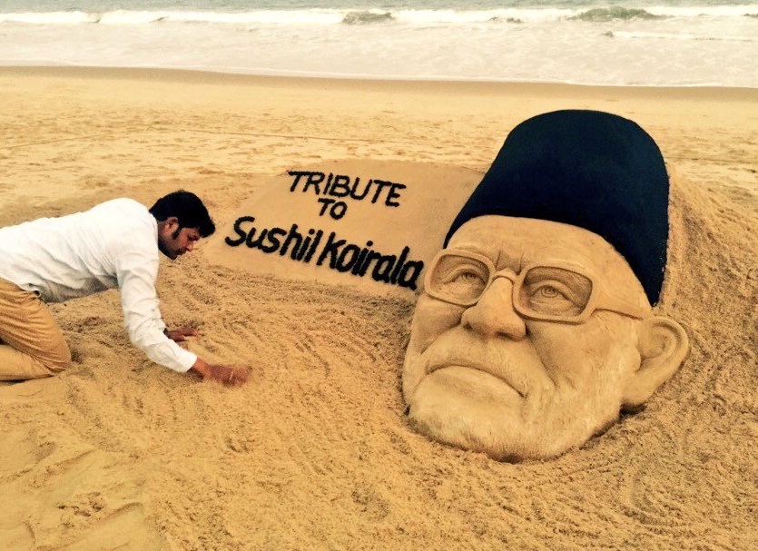 \"sushil-koirala\"काठमाडौं ।। भारतीय कलाकार सुदर्शन पटनायकले उडिसाको समुद्री तटमा स्वर्गीय कोइरालालाई समर्पण गरेर बालुवामा बनाएको बालुवा आर्टको तस्वीर मंगलबारदेखि नै सामाजिक संजालमा भाइरल बनेको छ । (कोइरालालाई आदर) भन्ने शब्दावलीका साथ कोइरारालाको शालीन प्रतिमाको फोटो सामाजिक संजाल फेसबुक, टी्वीटर र अनलाइनहरुमा भाइरल बनेको हो ।