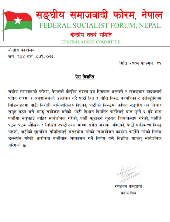 काठमाडाैं । संघीय समाजवादी फोरम, नेपालले केन्द्रीय सदस्य द्वय रिजवान अन्सारी र राजकुमार यादवलाई पदीय गरिमा र अनुशासनको उल्लंघन गरेको भन्दै पदबाट निष्काशन गरेको छ। फोरम नेपालले शनिबार एक विज्ञप्ति जारी गर्दै पार्टी नीति विरुद्ध पत्रपत्रिका र इलेक्ट्रोनिक्स मिडियाहरुमा पार्टी विरोधी  अभिव्यक्तिहरु दिएको भन्दै उनीहरुलाई निष्काशन गरेको बताइएको छ । पार्टीको विरुद्धमा कथित सङ्घीय नव विचार समूह गठन गरी आफू संयोजक बनेको, पार्टी विधान विपरित पार्टीलाई घात पुग्ने ६ बुँदे माग पार्टीमा नबुझाई बाहिर सार्वजनिक गरेको, पार्टी फुटाउने गुटगत क्रियाकलाप गरेको, पार्टीले पटक पटक मौखिक र लिखित स्पष्टीकरण माग्दा समेत जवाफ नदिएको, पार्टी एकीकरण विरुद्ध गएको भन्दै उनीहरुलाई केन्द्रिय सदस्यबाट निष्काशन गरिएको बताइएको छ । \"375f8c85-0979-42af-9154-caf2cdb8aad7\"