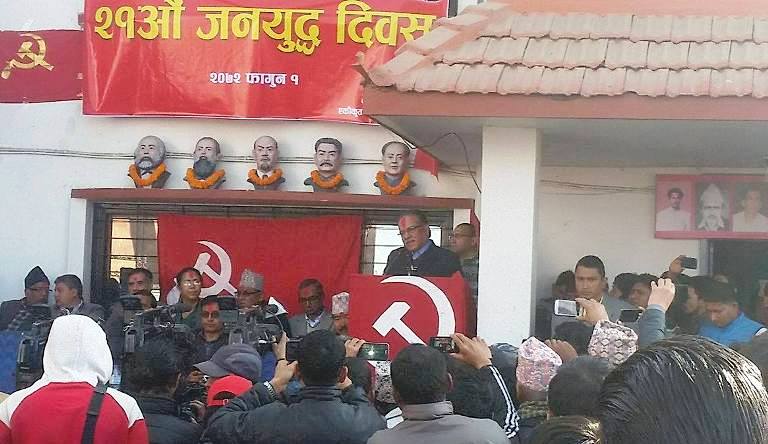 \"prachanda-1 काठमाडौं । एकीकृत नेकपा माओबादीका अध्यक्ष पुष्पकमल दाहाल ‘प्रचण्ड’ले अब सबै माओवादीहरु एक हुने बताएका छन् । माओबादी २१ औं जनयुद्ध दिबसको अवसरमा पार्टी केन्द्रीय कार्यालय पेरिसडाँडामा शनिवार आयोजित कार्यक्रममा बोल्दै प्रचण्डले सबै सच्चा देशभक्तलाई एकता गर्ने प्रतिबद्धता जनाए । पहिला माओवादी धाराहरुलाई एकताबद्ध गरेर तथा सच्चा कम्युनिष्ट र बामपन्थी शक्तिलाई एकताबद्ध गरेर इतिहासको जिम्मेवारी पूरा गर्ने उनले बताए । देशको परिवर्तन माओवादीका योजना अनुरुप भएको दाबी गर्दै प्रचण्डले केही हप्ताभित्रै माओवादीहरु एक हुने बताए । ‘समाजबादी कार्यदिशालाई अघि बढाउन सबै माओवादी एकता गछौं,’ उनले भने, “पहिला माओबादी धाराहरुलाई एकताबद्ध गरेर तथा सच्चा कम्युनिष्ट र बामपन्थी शक्तिलाई एकताबद्ध गरेर ईतिहासको जिम्मेवारी पुरा गर्नुछ ।” जुट्दा र फुट्दा के हुन्छ त्यो सबै माओबादीले महसुस गरेको उल्लेख गर्दै उनले अब जुटेर अघि बढ्ने बताए । उनले २०५२ सालको फागुन १मा जनयुद्ध घोषणा गर्दा देखिनै आफु सबै देशभक्त लाई एकताबद्ध गरेको बताउर्दै शान्तिप्रक्रियापछि माओबादी फुट्नु दुभाग्य भएको बताए । १६ हजार सहिदको बलिदानले १० बर्षमै देशमा गणतन्त्र आएको दाबी गदै अब सबै माओबादी एकता गरेर क्रान्तिको बाँकी कार्यभार पुरा गर्ने प्रतिवद्धता दोहोर्याए । उनले भने दश बर्षे जनयुद्धका मद्धाहरु सस्थागत गर्न सबै माओबादी मिल्नुको बिकल्प नभएको भन्दै भूकम्पपछिको पुननिर्माणमा जुटेर समृद्ध मुलुक बनाउनुपर्ने बताए । आर्थिक विकास हुँदैमा सुख हुँदैन एमाओवादी अध्यक्ष प्रचण्डले आर्थिक विकास हुँदैमा सबै जनाले सुख नपाउने बताए । एमाओवादी परित्याग गरी आर्थिक विकासका लागि भन्दै नयाँ शक्तिमा लागेका डा. बाबुराम भट्टराईतर्फ इंगित गर्दै उनले आर्थिक विकास हुँदैमा जनता धनी नहुने बताए । आर्थिक समृद्धि भनेको सामाजिक न्यायको सिद्धान्त हुनुपर्ने उनको भनाइ छ । सबै माओवादी जुटे दश वर्षमै समाजवाद प्रचण्डले सबै माओबादी जुट्ने र राष्ट्रिय एकता गर्ने हो भने अबको दश बर्पमा नेपाललाई समाजबादी देश बनाउने दाबी गरे । उनले सबै माओबादी, बामपन्थी, सच्चा कम्युनिष्टहरुको उद्देश्य अबको दशक समाजबादको दशक हुनुपर्ने बताए । प्रचण्डले नेपालको संबिधानले सबैको अधिकार सुनिष्चित गरेका बताउदै संबिधान महिलाहरुको सक्रिय सहभागितामा बनेको बताए । उनले अब नयाँ तवरले देशको क्रान्ति पुरा गर्ने बताए ।