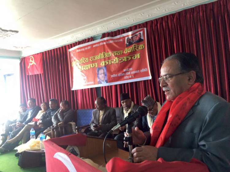 \"CMPrachanda\"काठमाडौं, । एमाओवादी अध्यक्ष पुष्पकमल दाहाल \'प्रचण्ड\' ले राष्ट्रको नेतृत्व अब माओवादीले गर्ने बताएका छन् । उनले राजनीतिमा लिएको पहलकदमीले जनतामा आशा जगाई दिएको र त्यसलाई संगठनमा रुपान्तरण गर्नुपर्ने बताउदै भने ‘अहिले सरकारमा पहल आएको छ । राष्ट्रको नेतृत्व गर्ने अब माओवादीले नै हो । जनताले पनि एमाओवादीलाई नै राजनीतिक शक्तिका रुपमा लिएको छ ।’ पार्टी केन्द्रीय कार्यालयमा आइतवार जातीय–क्षेत्रीय मोर्चा समन्वय समितिद्वारा आयोजित प्रदेश स्तरीय राजनीतिक तथा वैचारिक प्रशिक्षण कार्यक्रमलाई सम्बोधन गर्दै अध्यक्ष प्रचण्डले समाजवादको कार्यदिशा मूलमर्म भनेको वर्ग संघर्ष नै भएको बताउदै वर्ग संघर्ष समाजवादको यात्रामा बिर्सन नहुने कुरा भएको जिकिर गरे । अध्यक्ष प्रचण्डले ‘समाजवादी व्यवस्था भनेको सामाजिक न्याय सहितको आर्थिक समृद्धि भएको बताउदै वैचारिक र सांगठनीक एकताले पार्टी मजबुत हुने र त्यो कार्यभार पुरा गर्ने बिश्वास ब्यक्त गरे । उनले सबै माओवादी एक भए जनता पनि माओवादीप्रति एक हुने बताए । संविधान बनेपछि पार्टी नेतृत्वले लिएको पहलकदमीबाट देशभर एमाओवादीमा नयाँ रक्त सञ्चार पैदा भएको र अझै माओवादीप्रति जनतामा लहर ल्याउन बाँकी रहेको उहाँको भनाई थियो । उनले राजनीति भन्दा बाहिर कसैको पनि जीवन नभएको बताउँदै भने ‘देशभरमा पार्टीमा अहिले एकले अर्कालाई माया गर्न थालेको देखिएको छ ।’ उनले प्रधानमन्त्री केपी शर्मा ओलीको भारत भ्रमण बिग्रेको सम्बन्ध सुधार्न मात्र भएको बताउदै भने, ‘प्रधानमन्त्रीको भारत भ्रमण बिग्रेको सम्बन्ध सुधार्न मात्र हो कुनै सन्धी र सम्झौता गर्न होइन ।’ \'प्रचण्ड\' ले वर्तमान सरकारमा पनि मन्त्रीहरुले जनताका पक्षमा काम अघि बढाईरहेको स्पष्ट पारे ।