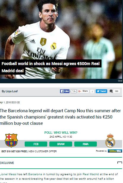 \"1Messi\"\"Messi\"काठमाडौं । विश्वचर्चित खेलाडी एवं पाँच पटकका विश्वका उत्कृष्ट फुटबलर लियोनेल मेसी कीर्तिमानी रकममा बार्सिलोना छाडेर रियल म्याड्रिडमा जाने भएका छन् । यसै सिजनको अन्त्यमा मेसी ५०० मिलियन युरोमा ५ वर्षका लागि रियलसँग अनुबन्ध हुने भएका हुन् । उक्त तयारीको आगामी शनिबार हुने यी दुई टिमबीचको एल क्लासिको भिडन्त अघि रियलको मैदान सान्टिएगो बर्नबाउमा घोषणा गरिनेछ । मेसी १३ वर्षको उमेरमा बार्सिलोनामा आएका थिए । मेसीले आफू बेचिनुको पछाडि आर्थिक खेल रहेको पनि बताए । मेसी रियल आउने भएपछि क्रिश्चियानो रोनाल्डोले पनि खुशी व्यक्त गरेका छन् । रियलको आधिकारिक विज्ञप्तीमा रोनाल्डोले अब रियलको फिनिसिङ लाइन सुधार हुने बताएको उल्लेख छ । तर, गोल डटकमलले यो समाचार अप्रिल फूलको बाइ लाइनमा लेखेको छ ।