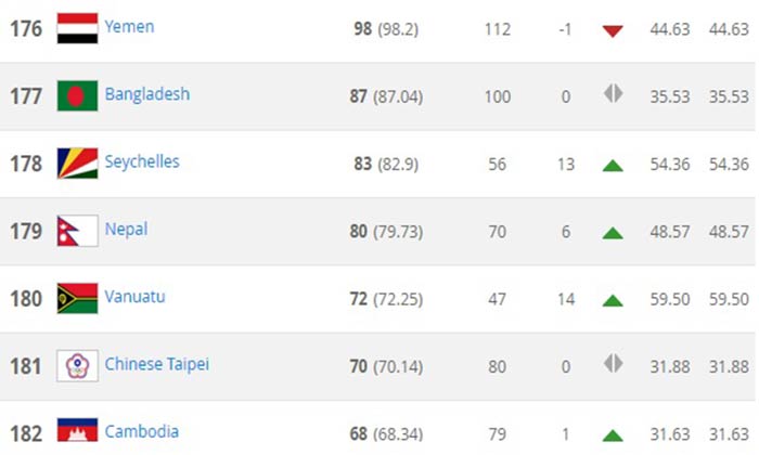 \"Fifa-world-ranking\"काठमाडौं । विश्व फूटबल संघ (फिफा) बरियातामा सुधार गर्दै नेपाल ६ स्थानमाथि चढ्दै १७९ स्थानमा आएको छ । गत महिना १८५ औँ स्थानमा रहेको नेपाल यो महिना ६ स्थान माथि उक्लँदै १७९ स्थानमा आईपुगेको हो । फिफाले बिहीबार सार्वजनिक गरेको बरियातामा नेपाल ठूलो सुधार गरेको हो । फिफा बरियातमा नेपालले ८० अंक प्राप्त गरेकोे जनाएको छ । दक्षिण एसियाली मुलुकमा नेपाल भन्दा माथि १४७ औँ स्थानमा अफगानिस्तान, १६० औँ स्थानमा माल्दिभ्स, १६२ औँ स्थानमा भारत र१७७ औँ स्थानमा बंगलादेश रहेका छन् । नेपाल भन्दा तल भुटान १८६ औँ स्थानमा छ भने श्रीलंका १८७ र पाकिस्तान १९० औँ स्थानमा छ । फिफा बरियताको पहिलो स्थानमा अर्जे्न्टिना रहेको छ । एजेन्सी