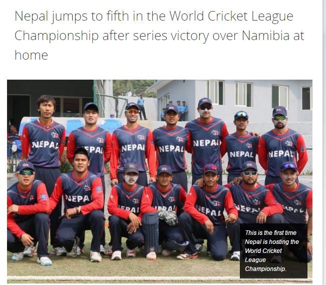 \"Icc\"\"namibian-captain\"काठमाडौं । नेपालले तीन वर्षपछि घरेलु मैदानमा आइसिसी विश्व क्रिकेट लिग च्याम्पियनसिपको सफल आयोजना मात्रै गरेन, विश्व क्रिकेटको ध्यान आफूतिर आकर्षित गर्न सक्यो । लिगका यस अघिका खेलमा पपुवा न्युगिनी र स्कटल्याण्डसँग ४ खेलमा पराजित भएपछि नेपाल दबाब थियो । तर, गृह मैदान नेपाललाई फाप्न पुग्यो । पहिलो खेलमा गत शनिबार नामिबियालाई ५ विकेटले जित्यो भने सोमबार रोमाञ्चमक खेलमा उच्च रन चेज गर्दै तीन विकेटले पाखा लगाएपछि नेपालको चर्चा चुलिएको छ । नेपालको जितलाई विश्व क्रिकेटको सर्वोच्च संस्था आइसिसीले सिरिज जितेपछि नेपालले च्याम्पियनसिपमा ५ स्थानमा फड्को मारेको विषयमा समाचार लेखेको थियो । भूकम्पले जर्जर भएको नेपालमा आइसिसीका सहयोगमा भएको खेलमा नेपालले उच्च प्रदर्शन गरेको जनाएको छ । आन्तरिक क्रिकेटको संस्थामा तीव्र विवादकाबीच नेपालले खेल जित्नुलाई महत्का साथ हेरिएको छ । आइसिसीको नेपाली क्रिकेट कल्चरको विषयमा निक्कै तारिफ गरेको छ । १० हजारले टिकट काटेर र त्यति नै संख्या स्टेडियमबाहिरबाट पनि समर्थकले क्रिकेट हेरेको लेखेको छ । नेपाल उपराष्ट्रपतिदेखि प्रधानमन्त्रीसम्मले नेपालले प्रभावशाली खेल खेल्दै जितेको खेलको साक्षी बनेको उल्लेख गरेको छ । नेपाल टेलिभिजनबाट प्रत्यक्ष प्रसारण र इन्टरनेटबाट विश्वभर खेल हेर्न पाएको पनि उल्लेख गरेको छ । नेपालको जितमा घरेलु मैदानमा दर्शकबीच खेल्न पाउनु र जित्नु महत्वपूर्ण पक्ष भएको बताएका छन् । नेपालले सफल आयोजना गर्न सक्छ भन्ने सन्देश दिएको पनि पारसले बताएका छन् । नेपालले पहिलो खेल जित्नुलाई महत्वपूर्ण रहेको भन्दै पारसले टिमले अझै आगामी अगस्टमा नेदरल्याण्डविरुद्ध हुने खेलमा कडा मेहनत गर्नुपर्ने बताएका छन् । दोस्रो खेल जिताउन पारसले शतकीय १०३ रन र शरद भेषवाकरले ७४ रनको महत्वपूर्ण पारी खेलेका थिए । नेपालसँग दुवै खेल हारेपछि नामिबियाका कप्तान स्टेफन बार्डले आफूहरु स्तब्ध भएको बताए । तर, बार्डले नेपालमा आएर हजारौ दर्शक अगाडि खेल्न पाउँदा भने खुशी व्यक्त गरेका छन् । नेपाली समर्थक साह्रै नै भद्र रहेका र नेपाली आतिथ्यताप्रति आनन्दित भएको पनि बताएका छन् ।