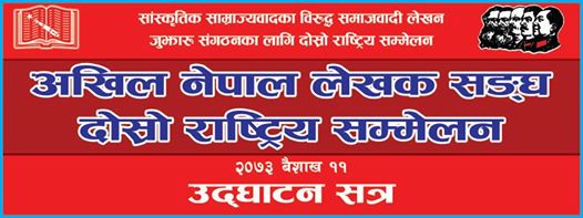 \"pustak\"काठमाडाैं । प्रगतिवादी लेखकहरूको संगठन अखिल नेपाल लेखक संघको दोस्रो राष्ट्रिय सम्मेलन शनिबार हुँदैछ ।  शनिबार लोकतन्त्र दिवस र विश्व पुस्तक दिवसकाे समेत सन्दर्भ पारेर सम्मेलनकाे अायाेजना गरिएकाे हाे । सम्मेलनको सम्पूर्ण तयारी सकिएको संघका कार्यवाहक संयोजक विष्णु भण्डारीले बताए ।दुवै दिवससमेत सम्मेलनकै क्रममा ‘सेलिब्रेट’ गरिने संघका कार्यवाहक संयोजक विष्णु भण्डारीले बताए । उनका अनुसार सम्मेलनमा देशका करिव ६५ जिल्लाबाट ती सय लेखक प्रतिनिधि काठमाडौं आउँदैछन् । ‘उपस्थित लेखकहरूले लोकतन्त्र दिवसको शुभकामना तथा पुस्तक आदानप्रदान गरी दुवै दिवस पनि साथै मनाउनेछन्,’ उनले भने । शनिबार बिहान ८ बजेबाट कोटेश्वर, पेरिसडाँडामा हुने सम्मेलन बेलुका सकिनेछ । सम्मेलनले आगामी तीन वर्षको लागि नेतृत्व छनोट गर्नुका साथै अबको लेखन कस्तो हुन्छ भन्नेबारे बहस पनि गर्ने संघका इन्चार्ज गणेश भण्डारीले बताए । ‘संघ एमाओवादी निकट लेखकहरूको भएपनि यसलाई पहिलेजस्तै साँघुरो घेरामा बाँध्नु उपयुक्त छैन भन्नेमा बहस भइरहेको छ । त्यस्तै अबको लेखन कस्तो हुनुपर्छ भन्ने विषयमा पनि सम्मेलनमा बहस हुनेछ,’ उनले भने । संघको यसअघि ०६४ मा पहिलो सम्मेलन भएको थियो ।