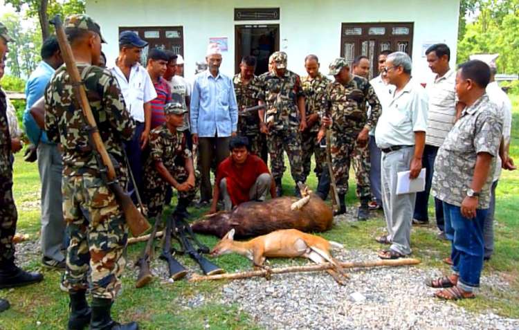 \"shikari-750\" नवलपरासी । नवलपरासीको बेनिमणिपुर सर्दी निवासी चित्रबहादुर सुनारी पेशाले कृषक हुन् । कृषि पेशाले नै उनको जीवन निर्वाह हुँदै आएको छ । कहिलेकसो जंगलमा गएकाबेला शिकार खेल्ने उनको शोक छ । त्यसैले कहिलेकाँही भरुवा बन्दुक बोकेर जंगल छिर्छन् । तर सधैं आफूले सोंचेजस्तो हुँदैन भन्ने सुनारीले बल्ल चाल पाएका छन् । बेनिमणिपुर गाविस–८ का सुनारी आइतबार भने शिकार खेल्ने शोकमा साथीहरूकाे लहलहैमा जंगल छिर्दा उनी बन कार्यालयका कर्मचारीको फन्दामा परे । सुनारीले जंगलमा एउटा बँदेल र रतुवाको शिकार गर्न भ्याएका थिए । त्यहीबेला जंगल गस्तीमा आइपुगेको सशस्त्र वन रक्षकसँग उनको जम्का भेट भयो । बन शिकारी भेटाएपछि सशस्त्र बन रक्षकहरुले पक्रन खोजेपछि उनले आफूसँग भएको भरुवा बन्दुकको सहारा लिन खोजे । तर उनको भरुवा बन्दुकबाट भएको एक्लो प्रयास सफल भएन । सुनारी भरुवा बन्दुकसहित पक्राउ परे । बन अधिकारीहरुले भने बन शिकारीहरुको ठूलो समूहसँग भिडन्त भएको जनाएका छन् । नवलपरासीको नयाँ बेलहानी गाविस अन्तर्गतको चुरे बन क्षेत्रमा शिकारीसँग दोहोरो भिडन्त भएको मा बन रक्षक र सिकारि बिच गोलि हानाहान सेक्टर बन कार्यालय अरुणखोलाका प्रमुख अरुणकुमार मिश्रले बताए । राष्ट्रिय बन क्षेत्रमा सिकारीहरु छिरेको सुराकी पाएपछि साहयक बन अधिकृत रबिन्द्रकुमार जीसीको नेतृत्वमा २१ जनाको शसस्त्र बन रक्षक टोली गस्तिमा गएपछि भिडन्त भएको मिश्रले बताए । दश जना सिकारीले चार राउन्ड फाएर गरेपछि जवाफि कारबाहीमा बन रक्षक हरुले ५ राउन्ड फाएर गरेको बताइएको छ । भिडन्तमा मानवीय क्षति भने भएको छैन । भिडन्तका क्रममा एक जना सिकारी पक्राउ गरिएको मिश्रले बताए । पक्राउ परेका सुनारीको साथबाट ३ थान भरुवा बन्दुक बरामद गरिएको सेक्टर बन कार्यालय अरुणखोलाले जनाएको छ । घटनास्थलबाट सिकारीहरुले सिकार गरेर लैजान लागेको १ थान रतुवा र १ थान बदेल पनि बरामद गरिएको बन कर्मचारीले बताए ।