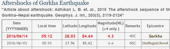 \"bhukmpa\" काठमाडौं । मंगलबार बिहानै भूकम्पको धक्का गएको छ । राष्ट्रिय भूकम्प मापन केन्द्रका अनुसार बिहान गोरखा केन्द्र भएर भूकम्पको धक्का गएको हो । बिहान ५ः१२ बजे ४.३ म्याग्नीच्युडको धक्का महशुस भएको केन्द्रले जनाएको छ । यो नयाँ भूकम्प नभएर गत बर्ष बैशाख १२ गते गएको भूकम्पकै परकम्पन हो । यस अघि सिन्धुपाल्चोक केन्द्र भएर ४.४ म्याग्नीच्युडको धक्का गएको थियो ।