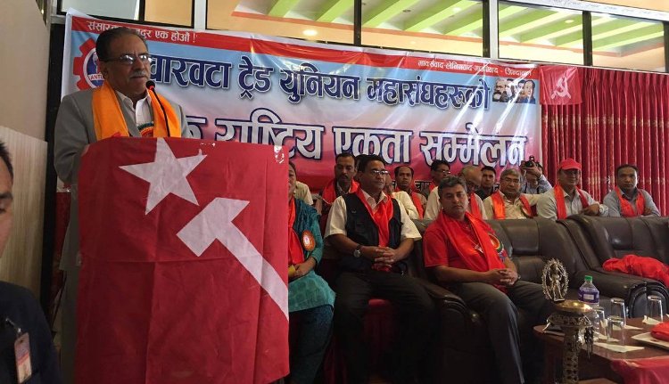 \"prachanda-tread\" काठमाडौँ, २५ असार । अखिल नेपाल ट्रेड युनियन महासङ्घलगायत विभिन्न छवटा मजदुर सङ्गठनबीच शनिवार एकता गरिएको छ । विभिन्न १० माओवादी घटकबीच पार्टी एकता घोषणा गरिएपनि जनवर्गीय संगठनहरुबीच एकता भएको थिएन । शनिवार मजुदर संगठनहरुको संयुक्त अधिवेशनले सालिकराम जम्मरकट्टेलको अध्यक्षतामा ७६५ सदस्यीय केन्द्रीय समिति चयन गरेको छ । संयुक्त अधिवेशनले उपाध्यक्षमा गणेश रेग्मी, जय कार्की, धनबहादुर विक, सोनालाल साह, उषा देवकोटा, एसबी थापा, कार्साङ लामा, राजेन्द्र किराती र कुमार छन्त्याललाई चयन गरेको छ । नवनिर्वाचित उपाध्यक्ष रेग्मीका अनुसार अधिवेशनले महासचिवमा जगत सिंखडालाई निर्वाचित गरेको छ । अधिवेशनले मजदुरको पेसागत हित, श्रम ऐनको कार्यान्वयन एवम् बदलिँदो परिवेशमा समयानुकूल श्रम तथा सोसँग सम्बन्धित ऐन नियमको निर्माणलगायतका विषयमा राजनीतिक प्रतिवेदनसमेत पारित गरेको छ । महाधिवेशनले सङ्गठनको नामसमेत अखिल नेपाल ट्रेड युनियन महासङ्घ नै कायम गरेको छ । महाधिवेशनको उद्घाटन नेकपा (माओवादी केन्द्र)का अध्यक्ष पुष्पकमल दाहाल प्रचण्डले गरेका थिए ।