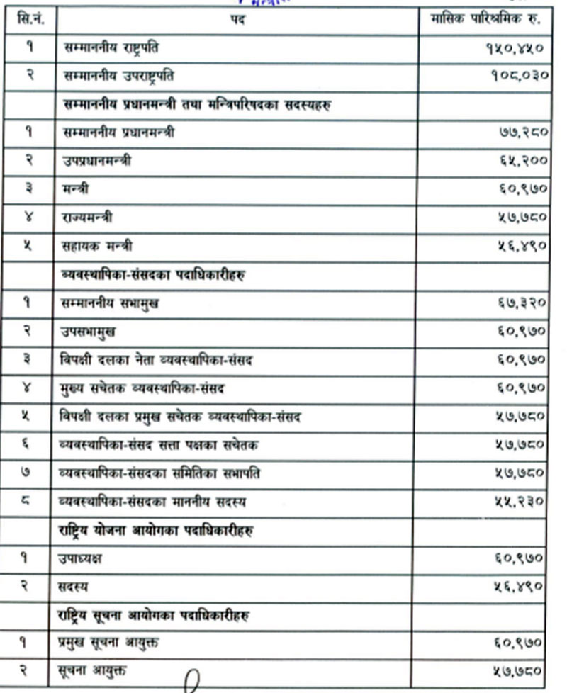 नयाँ तलवमान अनुसार राष्ट्रपतिको सबैभन्दा धेरै तलब १ लाख ५० हजार ४५० रुपैयाँ पुगेको छ । यसैगरी उपराष्ट्रपतिको १ लाख ८ हजार ३० र प्रधानमन्त्रीको ७७ हजार २८० रुपैयाँ तलब कायम भएको छ ।