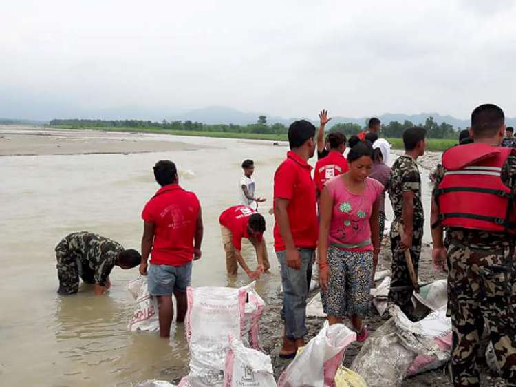 २४ फोटोमा हेर्नुहोस् : खोलोमा पसेर बाढी छेकिरहेका वाइसीयलका युवाहरु