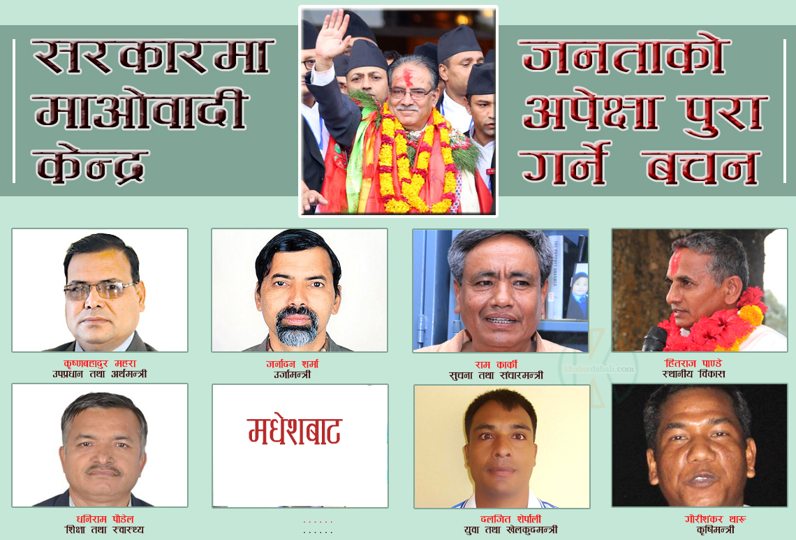 \"mao_mantri_cover\"काठमाडौं, ३० साउन  । नयाँ थपिएका मन्त्रीहरुको सपथ ग्रहण आइतबार अपरान्ह ३ बजे हुने भएको छ । प्रधानमन्त्री पुष्पकमल दाहाल ‘प्रचण्ड’ले आज तेस्रो पटक मन्त्रीमण्डल मन्त्रीमण्डल विस्तार गरेसँगै नयाँ थपिएका मन्त्रीहरुको पद तथा गोपनियताको सपथ ग्रहण आज अपरान्ह तीन बजे राष्ट्रपति निवास शितल निवासमा हुने तय भएको प्रचण्ड सचिवलयले जनाएको छ । आइतबार प्रधानमन्त्री तथा माओवादी अध्यक्ष प्रचण्डले जनआर्दन शर्मा , राम कार्की , हितराज पाण्डे, डीआए पौडेल , लगाएतलाई मन्त्री बनाउने निर्णय गरेको छ । जनआर्दन शर्माले उर्जा , राम कार्कीले सञ्चार , हितराज पाण्डेले स्थानिय विकाश , डीआर पौडेलले शिक्षा मन्त्रालयको जिम्मेवारी पाउने भएका छन् । माओवादीको भागमा परेको आठ मन्त्रालय मध्ये ३ मन्त्रीले यस अघिनै सपथ लिइसकेका छन् । नेपाली कांग्रेस अहिले सम्म २ जना बाहेक मन्त्रीमण्डलमा पठाउने मन्त्रीहरुको नाम चयन गर्न सकेको छैन । नेविसंघको महाधिवेशनमा कांग्रेस नेताहरु व्यस्त रहेकाले कांग्रेसले मन्त्रीको नाम छनौट गर्न नसेकेको कांग्रेस स्रोतले जनाएको छ ।