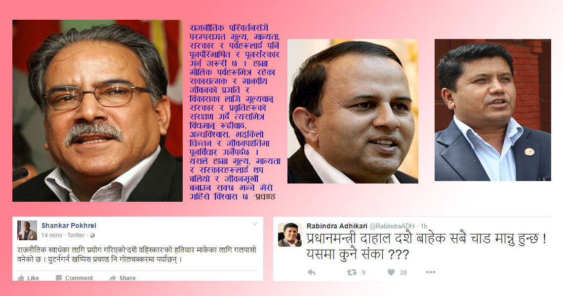 \"prachanda_shankhar_rabindra\"काठमाडौं, २६ असोज । बुधबार विहानै एमालेका प्रभावशाली मानिने नेताहरु शंखर पोखरेल र रविन्द्र अधिकारी प्रधानमन्त्री पुस्पकमल दाहाल प्रचण्डले दशैको टिका नलगाएको भन्दै छेडछाडमा देखिए । मंगलबार प्रधानमन्त्री प्रचण्डले आम नेपालीमा दशैंको शुभकामना दिदैँ दशैं पर्व परिस्कृत र परिमार्जत रुपमा मनाउन आग्रह गर्दै आफु पनि उसै गर्ने संकेत गरेका थिए ।  विगत ४० वर्षदेखि दशैंमा टिका नलगाएका प्रचण्डले यसपालीको दशैंमा पनि टिका लगाएनन् । प्राय सबै एमाले नेताहरुले आफ्नो धर्म र सँस्कारलाई हुबहु मान्दै आएकाले पनि हुनसक्छ प्रधानमन्त्रीको कदमप्रति रुष्टमात्रै भएनन् टिकाको भधोलिपल्टै सामाजिक संजाल फेसबुक र ट्विटरमा पोखिन थाले । एमाले नेता शंखर पोखरेलले सामाजिक संजाल फेसबुकमा लेखेका छन्, –‘राजनीतिक स्वार्थका लागि प्रयोग गरिएको ‘दशै वहिस्कार’ को हतियार माकेका लागि गलपासो वनेको छ । युटर्नगर्न खप्पिस प्रचण्ड नि गोलचक्करमा पर्याछन् ।’ याँहा नेता पोखरेलले चतुर्याईपूर्ण तरिकाले प्रचण्डले दशैं बहिस्कार गरेको भनेको छन् । बहिस्कार गर्नु र सँस्कृतिलाई परिमार्जन गर्दै मान्नुबिचमा ठुलो भिन्नता भएको कुरा नेता पोखरेलले बुझेकै हुनुपर्छ । तर उनले जानीजानी आम सर्वसाधारणमा प्रचण्डले दशैं बहिस्कार गरे भनेर सन्देश प्रभाह गर्न खोजेको देखिन्छ । उनले प्रचण्डले राजनीतिक स्वार्थका लागी भनेपनि आफैले प्रचण्डको दशैंप्रति राजनीति गरेको भेउ पाएनन् । यसैगरी एमालेका अर्का युवा नेता रविन्द्र अधिकारीले सामाजिक संजाल ट्विटरमा बुधबार नै प्रचण्डप्रति छेडछाड गरे । उनले प्रचण्डलाई छेड हान्दै लेखेका छन्, –‘प्रधानमन्त्री दाहाल दशै बाहेक सबै चाड मान्नु हुन्छ १ यसमा कुनै संका ?’ याँहा रमाईलो पक्ष के छ भने प्रधानमन्त्री प्रचण्डको पार्टी माओवादी केन्द्र र एमाले दुबैले आफुलाई सच्चा कम्युनिष्ट भएको दावी गर्छन् । कम्युनिष्टहरु भौतिकवादी हुनेहुँदा धर्म मान्दैनन् । सँस्कृति र परम्पराको बारेमा नेपालका कम्युनिष्टहरुबिच बहस छ । सँस्कृतिलाई कसरी मान्ने आआफ्नै धारणा छ । तर कम्युनिष्ट नेताहरुले सार्वभौम स्विकार गरेको कुरा भनेको सँस्कृतिलाई परिमार्जन गर्दै जानुपर्छ भन्ने हो । पोखरेल र अधिकारीले आफुलाई कम्युनिष्ट हुँ भन्छन् भने प्रचण्डले टिका नलगाउनुलाई समर्थन गर्नुपथ्र्यो । तर उनीहरुले प्रचण्ड हिन्दुहरुका विरुद्दमा छन् भनेर गुह्य राजनीति गर्न खोजेको प्रष्टै देखिन्छ । श्राद्द, पुजाआजा र मन्दिरमा खुलेआम धाउने एमालेका नेताहरुले हिन्दुधर्म अनुसारका परम्परा र सँस्कृति नमान्नेहरुको बरु अपमान गर्न खोजेका छन् । प्रचण्डले टिका नलगाउनु उनको आस्था, निष्ठा सँगै वैयक्तिक 