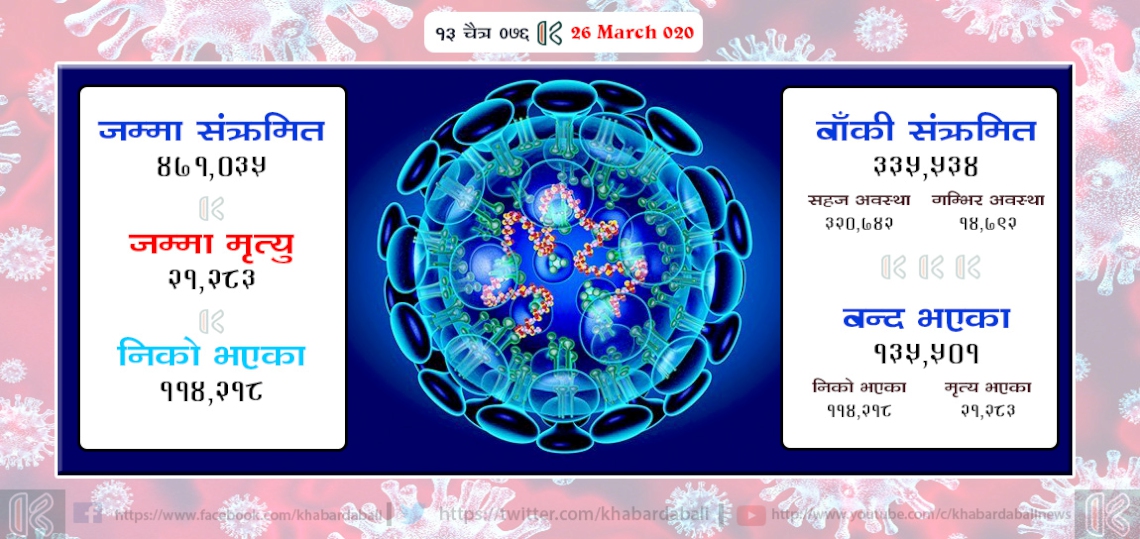 विश्वभर ४ लाख ७१ हजार ३५ जनालाई संक्रमित गरेको कोरोनाले हालसम्म २१ हजार २ सय ८३ जनाको ज्यान लिईसकेको छ । पछिल्लो २४ घण्टाभित्रमात्रै २हजार ३ सय ८९ जनाको ज्यान लिएको यो भाईरसको संक्रमणमा नेपालबाट ३ जना मात्रै देखिएका छन् ।