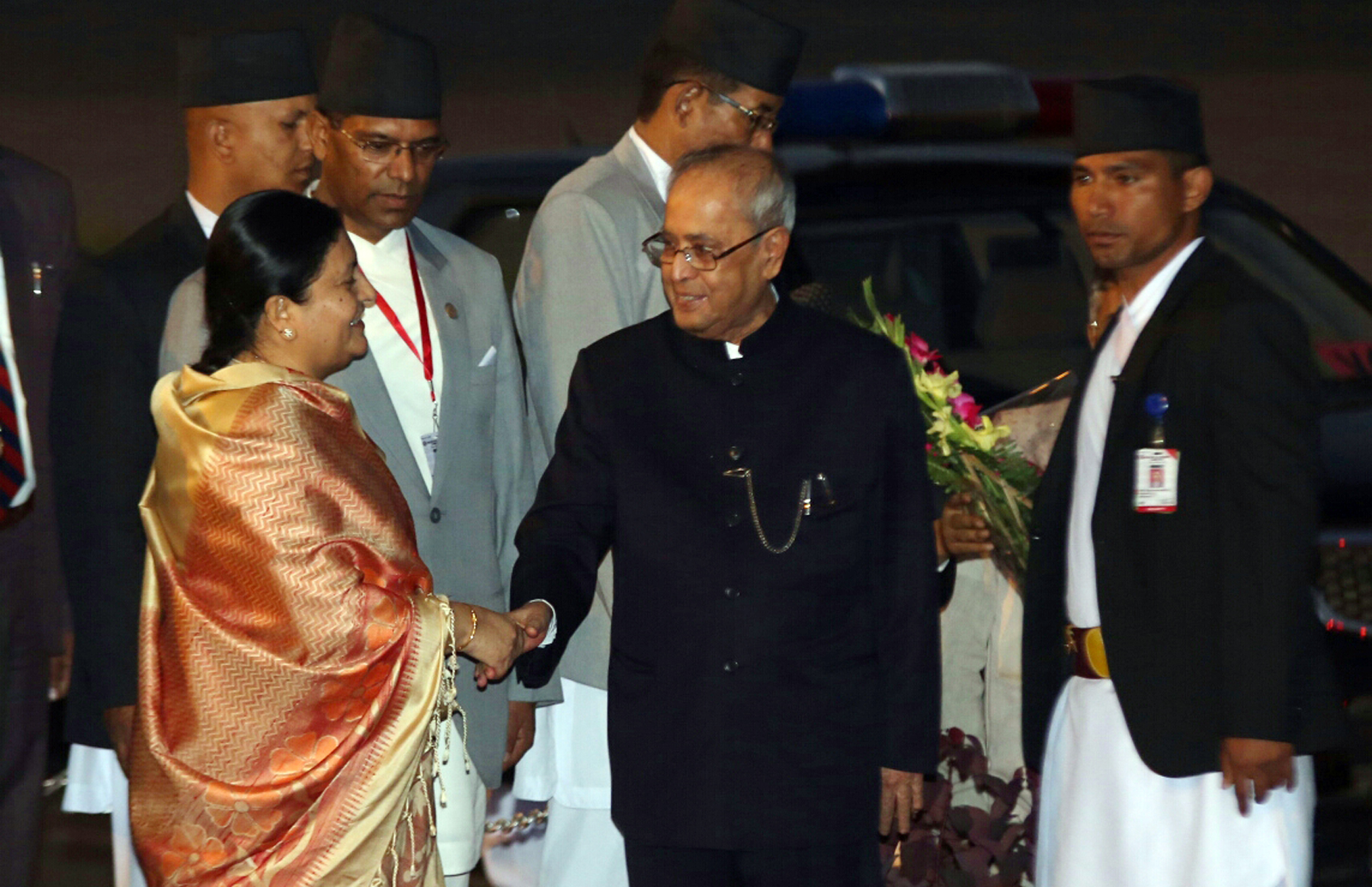 \"g]kfnsf] राष्ट्रपति मुखर्जी भारतीय वायुसेनाको विशेष विमानबाट आज अपराह्न ५ः३५ बजे स्वदेश फर्किएका हुन् । उनलाई त्रिभुवन अन्तराष्ट्रिय विमानस्थलको अतिविशिष्ट कक्षमा राष्ट्रपति विद्यादेवी भण्डारीले बिदाइ गरिन् । राष्ट्रपति मुखर्जीको सम्मानमा नेपाली सेनाले २१ तोपको सलामी अर्पण गरेको थियो । विदाईमा उपराष्ट्रपति नन्दबहादुर पुन, प्रधानमन्त्री पुष्पकमल दाहाल, उपप्रधानमन्त्रीद्वय विमलेन्द्र निधि र कृष्णबहादुर महरा, मन्त्रिगण, संवैधानिक निकाय र सुरक्षा निकायका प्रमुख, राजदूतलगायत उच्च सरकारी अधिकारी उपस्थित थिए । अठार वर्षपछि भारतका राष्ट्रपतिको नेपाल भ्रमण भएको हो । राष्ट्रपति मुखर्जी यही कात्तिक १७ गते नेपाल आएका थिए । नेपाल भ्रमणका क्रममा राष्ट्रपति मुखर्जीले उच्चस्तरीय भेटघाट गर्नाका साथै उहाँलाई काठमाडौँ र जनकपुरमा नागरिक अभिनन्दन गरिएको थियो । भ्रमणका क्रममा विभिन्न उच्चस्तरीय कार्यक्रममा सरिक भएका राष्ट्रपति मुखर्जीले काठमाडौँको पशुपतिनाथ र जनकपुरको रामजानकी मन्दिरमा विशेष पूजा गरेका थिए ।