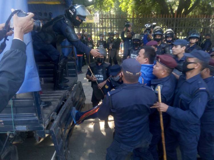\"biplab-lainchaur\"काठमाडौ, १९ कार्तिक । भारतीय सेनामा कार्यरत नेपालीलार्ई जोखिमपूर्ण क्षेत्रबाट फिर्ता गर्नुपर्ने र गोरखा भर्ति केन्द्र बन्द गर्नुपर्ने मागसहित प्रदर्शनमा उत्रिएका वैद्य माओवादीका पोलिटब्युरो सदस्य अनिल शर्मा विरहीसहित १४ जनालाई प्रहरीले राजधानीबाट पक्राउ गरेको छ । गत कात्तिक १५ गतेका दिन जम्मुकश्मिरको राजौरी—बालकोट— मेंढर नजिकको ‘लाइन अफ कन्ट्रोल’मा भारतीय सेनामा कार्यरत नेपालका विमल तामाङको मृत्यु भएपछि गोरखा भर्ती बन्द गर्नुपर्ने माग गर्दै सो पार्टीले आज शान्तिबाटिकामा प्रदर्शन गर्ने क्रममा प्रहरी र माओवादी कार्यकर्ताबीच झडप भएको हो । महानगरीय प्रहरी परिसर काठमाडौँका प्रवक्ता प्रहरी उपरीक्षक प्रद्युम्न कार्कीले प्रदर्शनको क्रममा १३ जनालाई पक्राउ गरिएको जानकारी दिए । शान्ति सुरक्षालाई ध्यानमा राखी उनीहरुलाई नियन्त्रणमा लिइएको उनको भनाइ छ । माओवादीका केन्द्रीय सदस्य गुणराज लोहनीले पोलिटब्युरो सदस्य शर्मासहित आकाश भेटवाल, प्रकाश दाहाल, रवि गोले, साहस भट्ट, टङ्क जोशी, ध्रुव अधिकारी, प्रकाश अधिकारीलगायत १४ जनालाई पक्राउ गरिएको जानकारी दिए । शान्तिबाटिकाबाट जुलुससहित लैनचौरस्थित नेपालका लागि भारतीय दूतावासमा ज्ञापनपत्र बुझाउने कार्यक्रम रहेकामा शान्तिबाटिकामा प्रहरी हस्तक्षेपपछि ज्ञापनपत्र बुझाउने आजको कार्यक्रम स्थगित भएको केन्द्रीय सदस्य लोहनीले बताए । माओवादीले नेपाली गोर्खालाई समान सुविधा प्रदान गर्न र गोर्खा भर्ति केन्द्र बन्द गर्न माग गरेको छ । रासस