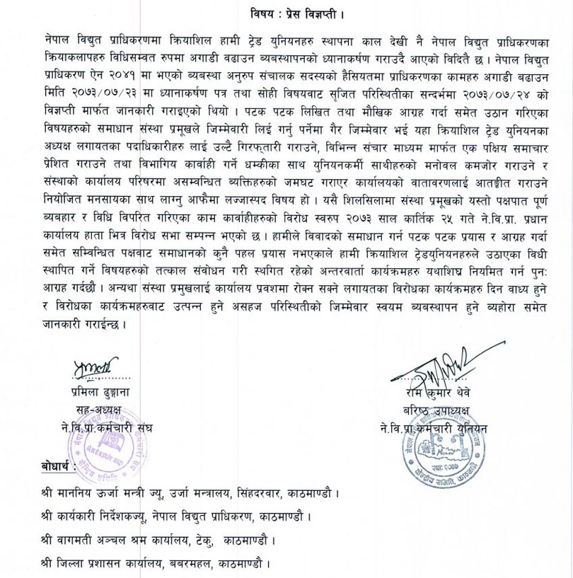 काठमाडौं, २६ कात्तिक ।  विद्युत प्राधिकरणका कार्यकारी निर्देशक कुलमान घिसिङलाई कार्यालय प्रवेशमा रोक लगाउने कर्मचारी ट्रेड युनियनहरुले चेतावनी दिएका छन् । आज संयुक्त प्राधिकरण कर्मचारी संघ र कर्मचारी युनियनले चेतावनी दिएका हुन् । बिज्ञप्तिमा भनिएको छ ‘ संस्थाको जिम्मेवारीमा रहेका प्रमुखले कसैसंग सल्लाह नगरी एकलौटी रुपमा काम गरेको भनिएको छ ।’ प्राधिकरण कर्मचारी संघ र कर्मचारी युनियनको संयुक्त बिज्ञप्तिमा सहअध्यक्ष प्रमिला ढुङ्गाना र युनियनका तर्फबाट बरिष्ठ उपाध्यक्ष रामकुमार थेबेद्धारा हस्ताक्षरित बिज्ञप्तिमा भनिएको छ ‘ मिडियामा एकापक्षिय समाचार संप्रेशन गर्न लगाएको, संस्थाको वरपर विभिन्न व्यक्तिहरु जमघट गराई कार्यालय वातारवरण खलबल्याएको बताईएको छ । प्राधिकरणको विवाद समाधान गर्न आग्रह गर्दा समेत अटेर गरेको विज्ञप्तिमा उल्लेख गरिएको छ । \"nea-press-relese\"   याे पनि पढ्नुस ः एमाले मन्त्री ज्ञवालीले अयाेग्य भनि हटाएका कुलमानले गरे चमत्कार