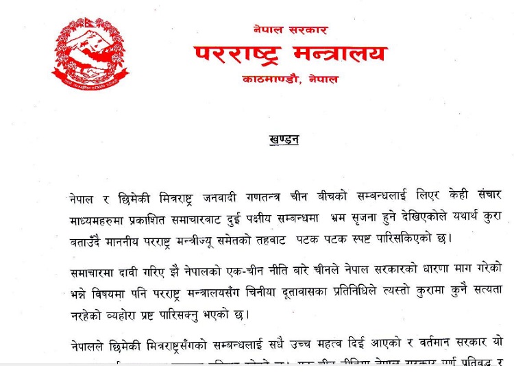 \"ppp1\"काठमाडौँ, २६ कात्तिक । परराष्ट्र मन्त्रालयले मन्त्रालयले एक चीन नीतिमा नेपाल सरकार पूर्ण प्रतिबद्ध र दुढ रहँदै आएको स्पष्ट पारेको छ । मन्त्रालयले आज विज्ञप्ति जारी गरी नेपाल र चीनबीचको सम्बन्धलाई लिएर केही सञ्चारमाध्यममा प्रकाशित समाचारबाट द्विपक्षीय सम्बन्धमा भ्रम सिर्जना गर्ने खोजिएको तर त्यसमा सत्यता नभएको जनाएको छ । समाचारमा दाबी गरिए झैँ नेपालको एक चीन नीतिबारे चीनले नेपाल सरकारको धारणा माग गरेको भन्ने विषयमा समेत कुनै सत्यता नभएको उल्लेख गरिएको छ । नेपालले छिमेकी मित्र राष्ट्रसँगको सम्बन्धलाई सधैंँ उच्च महत्व दिई आएको र वर्तमान सरकार उक्त सम्बन्धलाई थप सुदृढ बनाउन प्रतिबद्ध रहेको बताउँदै मन्त्रालयले मित्रराष्ट्रसँगको सम्बन्धका बारेमा समाचार सम्प्रेषण गर्दा विषयको संवेदनशीलताप्रति आवश्यक सावधानी अपनाउन आग्रह गरेको छ ।