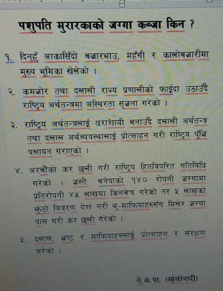 \"muraarak-jagga\"काभ्रे, २७ कात्तिक । नेकपा माओवादीले उद्योग वाणिज्य महासंघका अध्यक्ष पशुपति मुरारकाको जग्गा कब्जा गरेको छ । बनेपामा रहेको मुरारकाको १ सय ४० रोपनी जग्गा कब्जा गरेको हो । शनिबार विप्लब नेतृत्वको माओवादीले मुरारकाले दिनहुँ आकाशिदो बजार भाउ, महंगी र कालोबजारीमा मूख्य भूमिका खेलेकोले जग्गा कब्जा गर्नुपरेको आरोप लगाएको छ ।