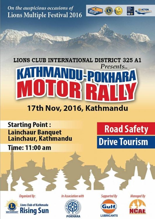 \"lions-rally\" काठमाडौं, २८ कात्तिक । मंसिर २ गते अर्थात नोभेम्बर १७ काठमाडौंदेखि पोखरासम्म लायन्स मोटर ¥याली हुने भएको छ । लायन्स क्लब इन्टरनेसनल डिष्ट्रिक्ट ३२५ ए १ ले नेपाल अटोमोबाइल्स एसोसिएसन (नासा) को प्राविधिक सहयोगमा ¥याली गर्ने भएको हो । लैनचौर ब्यांक्वेटबाट विहान ११ बजे प्रारम्भ हुने उक्त ¥याली विभिन्न स्थान हुँदै पोखरा पुग्नेछ । सोही समयमा पोखरामा लायन्स मल्टिपल फेस्टिभल २०१६ समेत आयोजना हुँदैछ । त्यसैले पनि यस पटकको ¥याली विशेष महत्वको हुनेछ । ¥यालीको सम्पूर्ण व्यवस्थापन लायन्स क्लब इन्टरनेसनल डिष्ट्रिक्ट ३२५ ए १ मा आवद्ध लायन्स क्लब अफ काठमाडौं राइजिङ सनले गर्नेछ । मोटर ¥यालीबाट लायन्स सदस्यहरु पनि रोड सेफ्टी र ड्राइभ टुरिजम्को क्षेत्रमा सहभागी हुने र आगामी दिनमा यो क्षेत्रमा थप कार्य गर्न सकिने लायन्स क्लब अफ काठमाडौं राइजिङ सनका अध्यक्ष तथा ¥याली संयोजक मधुसूदन सिग्देलले बताए् । उक्त ¥यालीलाई गल्फ लुब्रिकेन्ट्सले मूख्य रुपमा प्रायोजन गरेको छ ।