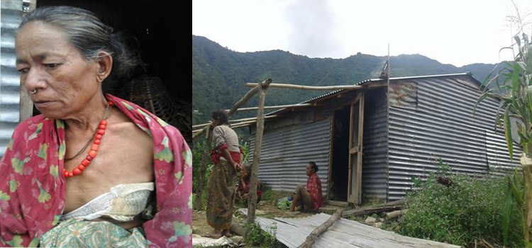 \"kanchhi-tamang\" काठमाडौं, १ मंसिर । सिन्धुपाल्चोक हैबुङ–५ द्वारेटोल कि कान्छी तामाङ महिनौंदेखि उपचार अभावमा छट्पटिरहेकी छिन् । अन्दाजी ६० वर्षीया कान्छीको पनि कांग्रेस नेतृ सुजाता कोइरालाको जस्तै स्तनमा समस्या छ । सुजाताले मलेशियामा पुगेर आफ्नो स्तनको समस्या पत्ता लगाइन् भने कान्छी रोगको पहिचानका लागि स्वास्थ्य केन्द्र नभई धामी झाँक्री कहाँ धाइरहेकी छन् । करोडौं सम्पत्तिको मालिक नेपाली कांग्रेसकी नेतृ कोइरालाले राज्यबाट उपचार खर्चको नाममा लाखौं रुपैयाँ पाइरहँदा तामाङ भने अार्थिक अभावमा दैनिक झारफुक गरिहेकी छिन् । राजधानीमा घर गाडीसमेत भएकी कोइराला आफै उपचार गर्न सक्षम हुँदा हुँदै हालै मन्त्रीपरिषद बैठकले उनलाई क्यान्सर भएको आशंकामा ५० लाख रुपैयाँ दिने निर्णय गरेको थियो । तर सिन्धुपाल्चोकको विकट गाविस हैबुङकी कान्छी तामाङ उपचार गर्ने र औषधि खाने पैसा अभावमा आफनो छातीमा भयानक घाउका साथ कष्टकर जीवन बाँचिरहेकी छिन् । स्तनमा घाउकै कारण महिनौंअघिदेखि तामाङ हिडडुल गर्न सकेकी छैनन् । कसैले पकाएर दिए खान्छिन् नत्र भोकै बस्छिन् । न त काम गर्न सक्छिन् न त कतै हिड्डुल गर्न । उनी वर्षौं अघिदेखिकी बिरामी तर पनि उनले कसैलाई भन्न सकेकी थिइनन् । सहनै नसक्ने भएपछि ३ महिनाअघि मात्र गाउँलेलाई भनेकी थिइन् । सहनै नसकेर थला परेपछि उनको घाउ दुख्ने भएकाले कम्मरदेखि माथिको भागमा कुनै कपडा नलगाएको पनि महिनौं दिन भइसक्यो । कपडा लगाउँदा घाउमा टाँसिने भएकाले फरियाको फेरले उनको शरिर ढाकिरहेको छ । गत बैशाख १२ गतेको विनाशकारी भूकम्पले क्षण भरमै ध्वस्त बनाएकाले अहिले उनको परिवार जस्तापाताको अस्थायी टहरामा बस्छिन् । टहराको एकापट्टि भागमा बाख्रा बाध्ने गरेका छन्, अर्को भागमा उनको परिवार बस्ने गरिएको छ भने ढोकाको छेउमै भान्सा बनाइएको छ । तामाङको देब्रे छात्तिको भागमा ठूलो घाउ छ । बर्षौं दिन अघिदेखि छात्तिको देब्रे भागमा उनको घाउ थियो । तर उनले कसैले भनेकि थिइनन् । तर करिब तीन महिना अघिदेखि उनलाई उक्त घाउले निकै पिरोल्न थालेपछि अरुलाई भन्न बाध्य भईन् उनी अर्थात कान्छीमाया । उनको घाउबाट निरन्तर पीप जस्तो देखिने सेतो पदार्थ बगिरहेको छ । हुन त सुन्दा अचम्म लाग्न सक्छ तरपनि उनले अझसम्म अस्पताल देखकी छैनन् । उपचारका लागि उनी कुनै मेडिकल नै गएकी छैनन् । बिरामी भएको लामो समयसम्म पनि औषधि किन्ने पैसा अभावमा उनी अहिलेसम्म जँचाउन जान सकेकी छैनन् । उनको घाउ दुखेर सहन नसक्ने भएपछि मात्र गाउनले धामी झाँक्री बोलाउँछिन् र झारफुक गर्न थाल्छिन् । अहिले उनको दैनिक झारफुक गर्दैमा वित्ने गरेको छ । बर्षैंदेखिको छात्तिको घाउलाई झारफुक गरेर निको पार्ने अन्धविश्वास भन्दा पनि तामाङ