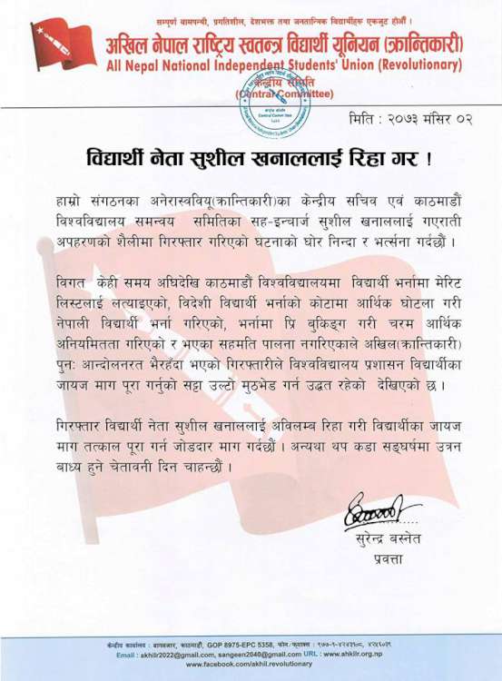 \"anerasobiu-750\" काठमाडौं, २ मंसिर । अनेरास्ववियू (क्रान्तिकारी)का केन्द्रीय सचिव एवं काठमाडौं विश्वविद्यालय समन्वय समितिका सह (इन्चार्ज सुशील खनाललाई रिहा गर्न माग गरेको छ । गएराती अपहरणको शैलीमा गिरफ्तार गरिएको भन्दै अनेरास्ववियू (क्रान्तिकारी)ले जारी गर्दै रिहाको माग गरेको हो । प्रबक्त्ता सुरेन्द्र बस्नेतद्धारा हस्तक्षरित विज्ञप्तिमा भनिएको छ विगत केही समय अघिदेखि काठमाडौं विश्वविद्यालयमा विद्यार्थी भर्नामा मेरिट लिस्टलाई लत्याइएको, विदेशी विद्यार्थी भर्नाको कोटामा आर्थिक घोटला गरी नेपाली विद्यार्थी भर्ना गरिएको, भर्नामा प्रि वुकिङ् गरि चरम आर्थिक अनियमितता गरिएको र भएका सहमति पालना नगरिएकाले पुन आन्दोलनरत भइरहंदा भएको गिरफ्तारीले विश्वविद्यालय प्रशासन विद्यार्थीका जायज माग पूरा गर्नुको सट्टा उल्टो मुठभेड गर्न उद्धत रहेको देखिएको छ । गिरफ्तार विद्यार्थी नेता सुशील खनाललाई अविलम्ब रिहा गरि विद्यार्थीका जायज माग तत्काल पूरा गर्न अनेरास्ववियू (क्रान्तिकारी)ले माग गरेको छ । यदि कडा संघर्षमा उत्रन वाध्य हुने बिज्ञप्ति मार्फत चेतावनी दिएको छ ।