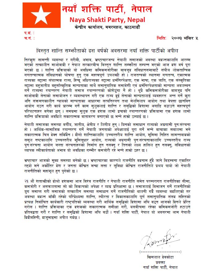 काठमाडौं, ५ मंसिर । विस्तृत शान्ती सम्झौता सम्पन्न भएको १० औं वर्षको अवसरमा नयाँ शक्ति नेपालले द्वान्दको व्यवस्थापनको सकारात्मक परिणाम निस्किएको ठहर गरेको छ । १० वर्ष पुगेको अवसरमा नयाँ शक्तिले एक अपिल सार्वजनिक गर्दै भनेको छ, –‘ समग्रमा मुलुक एक दशक लामो द्वन्दको रुपान्तरणको प्रक्रियामा एक दशक लामो शान्ति प्रक्रियाको अवधिले सकारात्मक वातावरण बनाएको छ भन्ने हाम्रो ठम्याई छ ।’ साथै मुलुकको मुख्य रोग भ्रष्टाचार रहेको समेत नयाँ शक्तिले उल्लेख गरेको छ । \"naya_shakti\"